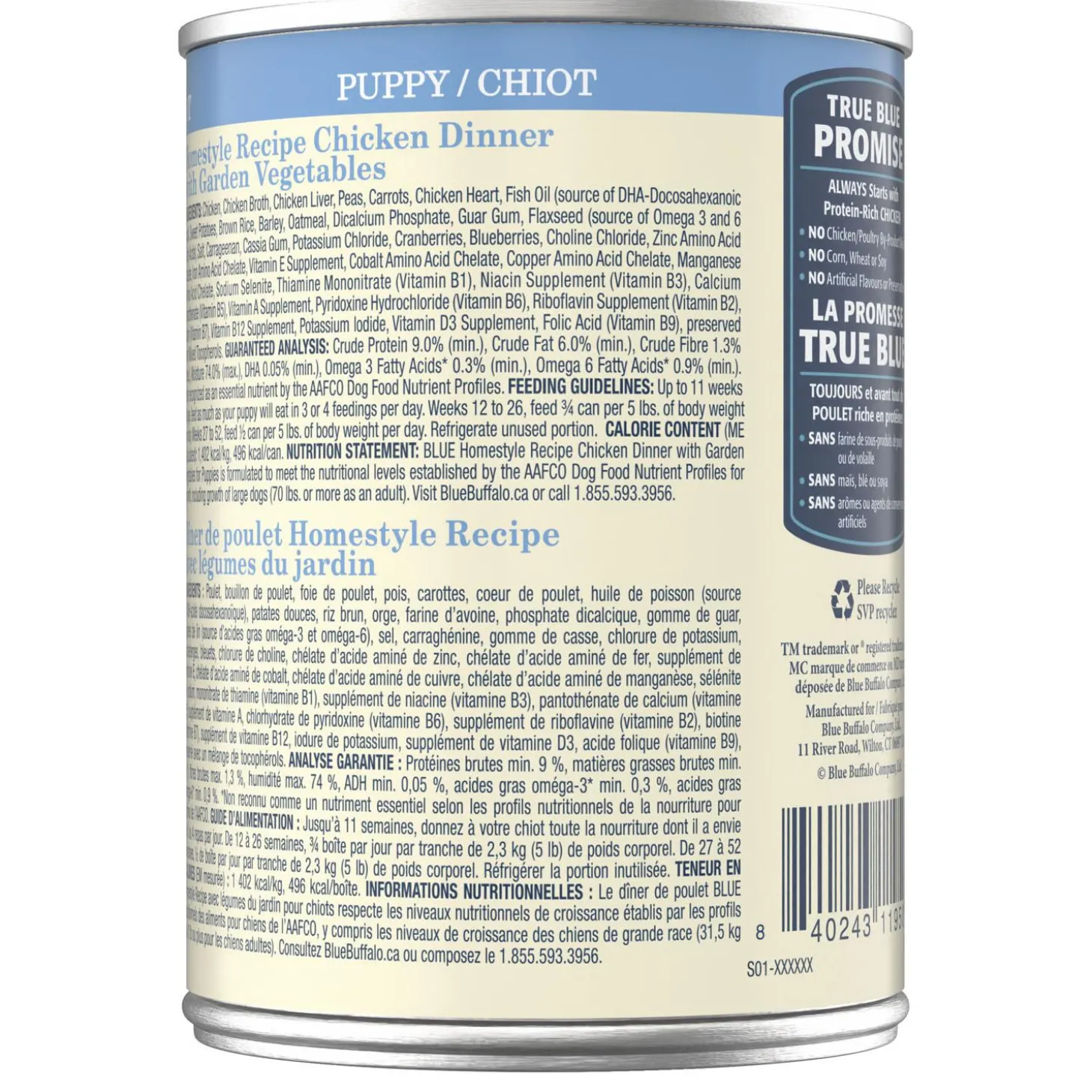 Blue Buffalo Homestyle Recipe Chicken Dinner with Garden Vegetables Puppy Dog Food is made with real chicken first, plus garden fruits and veggies. This recipe is packed with the finest natural ingredients and enhanced with vitamins and minerals. When it comes to making tails wag, nothing does it better than Blue Homestyle Recipes.