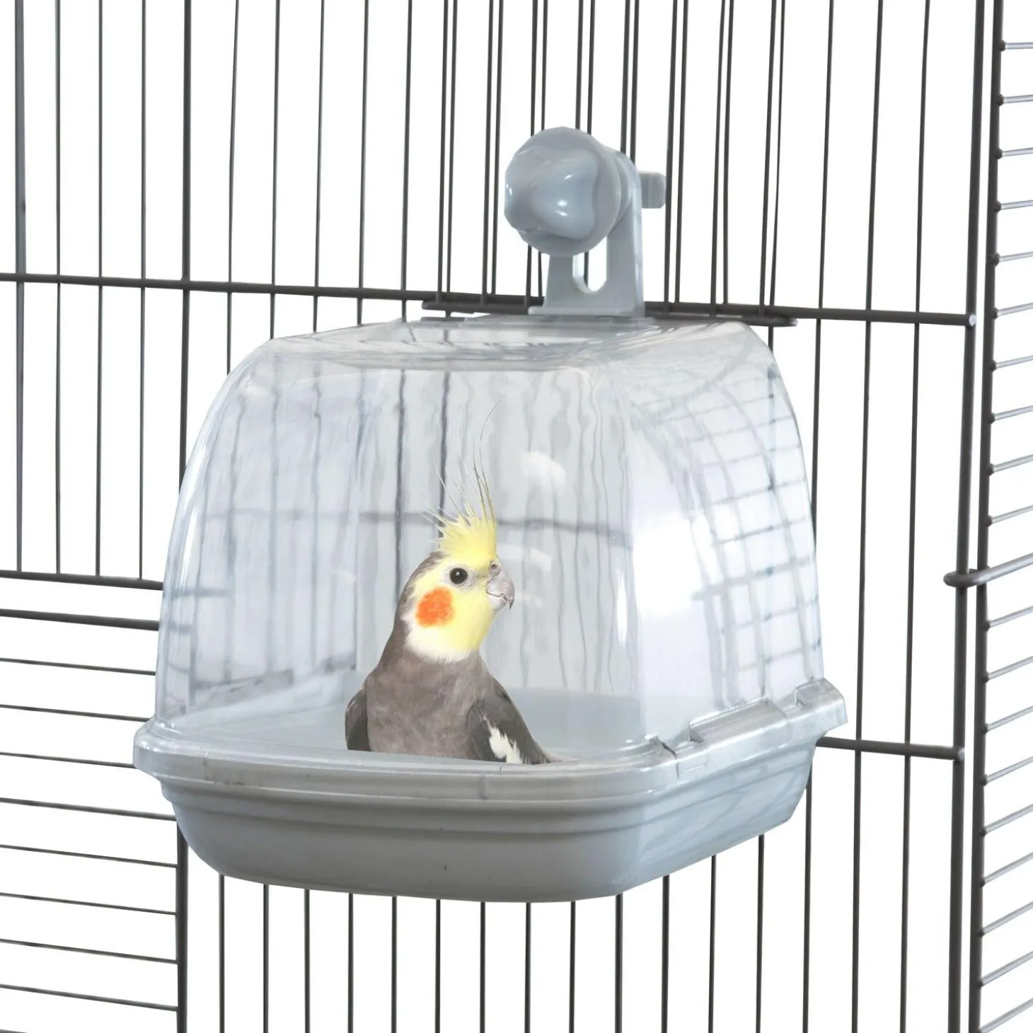 Featherland Paradise Hooded Bird Bath is a mess-less way for small birds to bathe. The hood design helps keep water in the cage and keeps birds from flying out as they bathe. Birds will love having access to a bath anytime! It is made from BPA-Free plastic and is easy to fill and clean. It easily attaches to the outside of a feeding station in your cage. Dimensions: 4″ L x 6″ W x 6.25″ H (10.16cm L x 15.24cm W x 15.88cm H)
