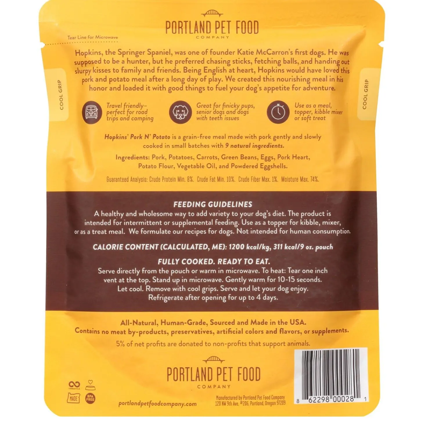 Portland Pet Hopkins’ Pork N’ Potato Homestyle Dog Meal is crafted with USDA certified pork sourced in the Pacific Northwest, Hopkins’ Pork N’ Potato is prepared in human grade facilities, slowly cooked in small batches with only 9 natural ingredients that are good for your four-legged friends. They are sourced from human-grade, all natural meat raised without antibiotics or hormones so you can add variety and flavour to your dog’s diet with their shelf stable, homestyle meals & toppers. The pouches are shelf-stable for two years, microwavable, earth friendly, and BPA free so you can feel good while your dog eats well.