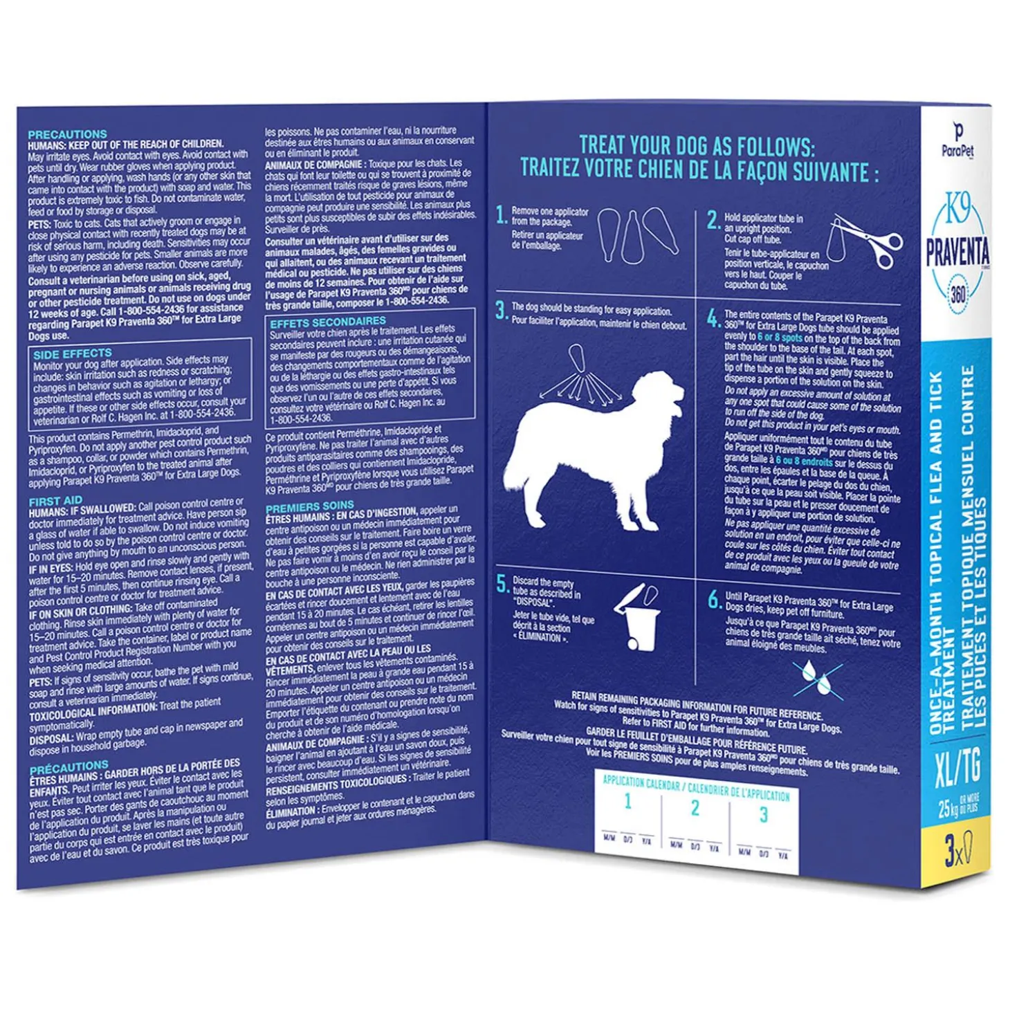 ParaPet K9 Praventa 360 Extra Large Dogs Flea & Tick Treatment is a fast-acting, monthly topical flea & tick treatment. Containing Imidacloprid, Permethrin and Pyriproxyfen, the same active ingredients found in the leading veterinary brand, K9 Praventa 360 for Dogs is a vet-quality, broad-spectrum treatment that kills and repels fleas and ticks on contact. Applying a topical is important to control flea infestations. K9 Praventa 360 for Dogs not only kills adult fleas but affects each life stage, continuing to work by preventing flea eggs and larvae from developing. The benefit of a topical is that it kills pests on contact rather than by ingestion, therefore it does not enter the pet’s bloodstream. K9 Praventa 360 provides long-lasting protection, controlling fleas and ticks within one day of treatment and continuing to protect the dog from further infestation for up to four weeks.