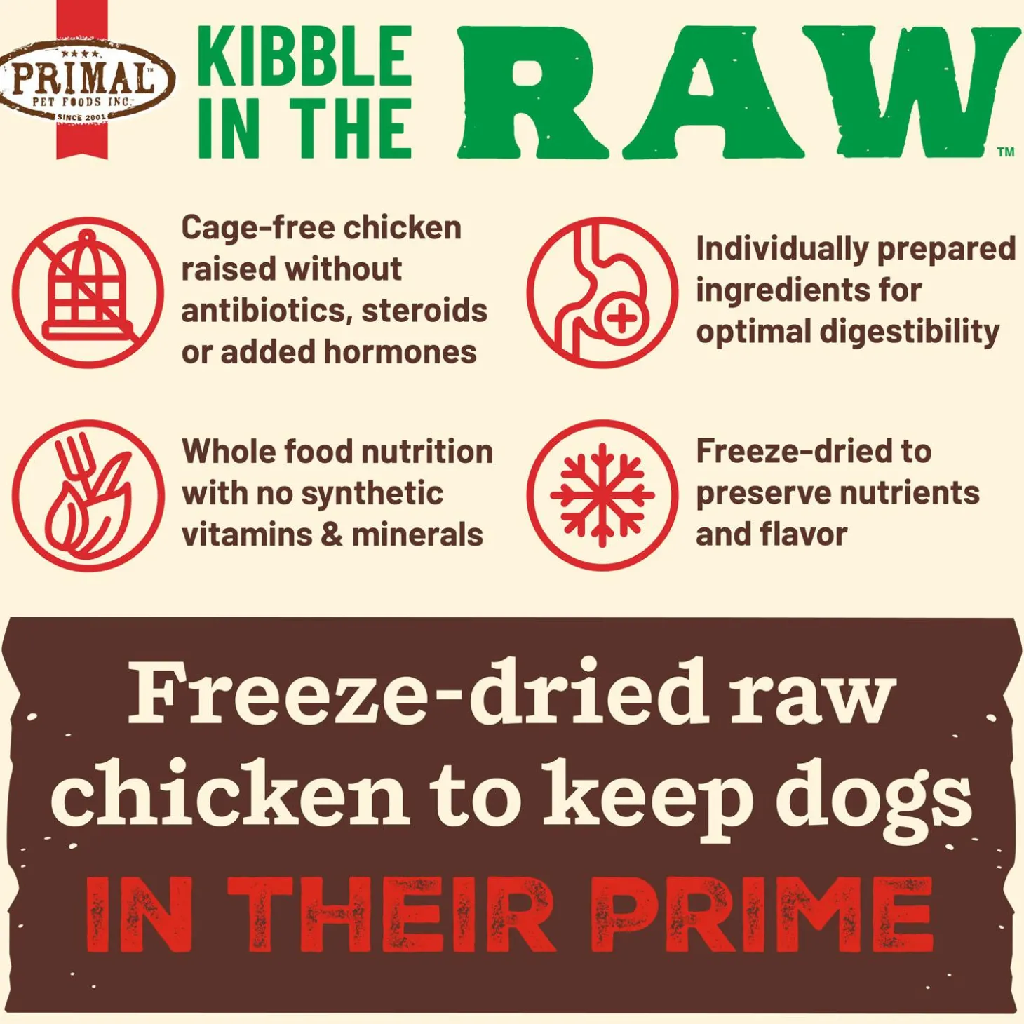 Primal Kibble in the Raw Chicken Recipe Small Breed Adult Dog Food has nutrition & convenience in perfect harmony! Kibble in the Raw reimagines “kibble” the Primal way so that you can feed your dog the way nature intended. Recipes are crafted to nourish like raw with thoughtfully selected, premium ingredients for optimized nutrition and digestibility, and serves like kibble with an easy scoop-and-serve format.