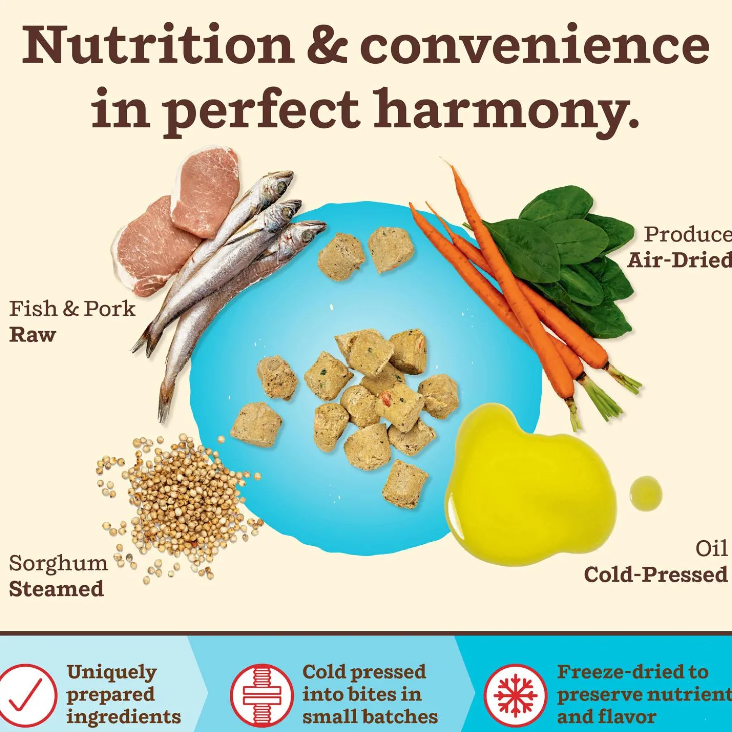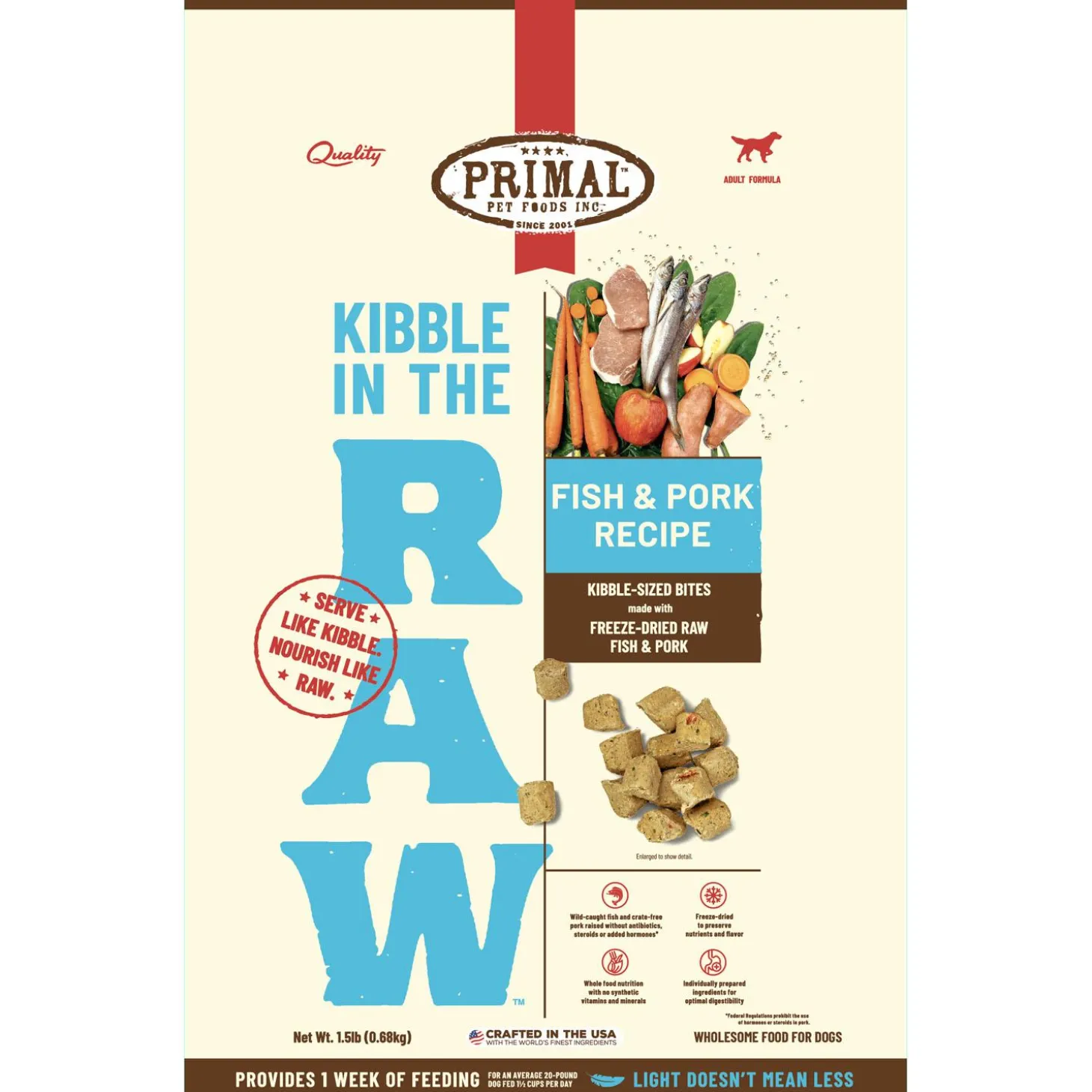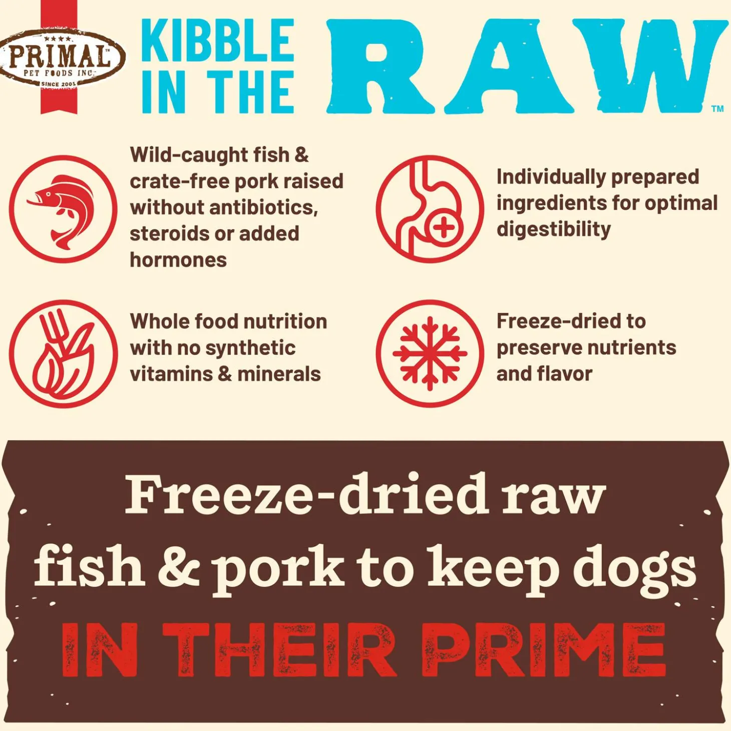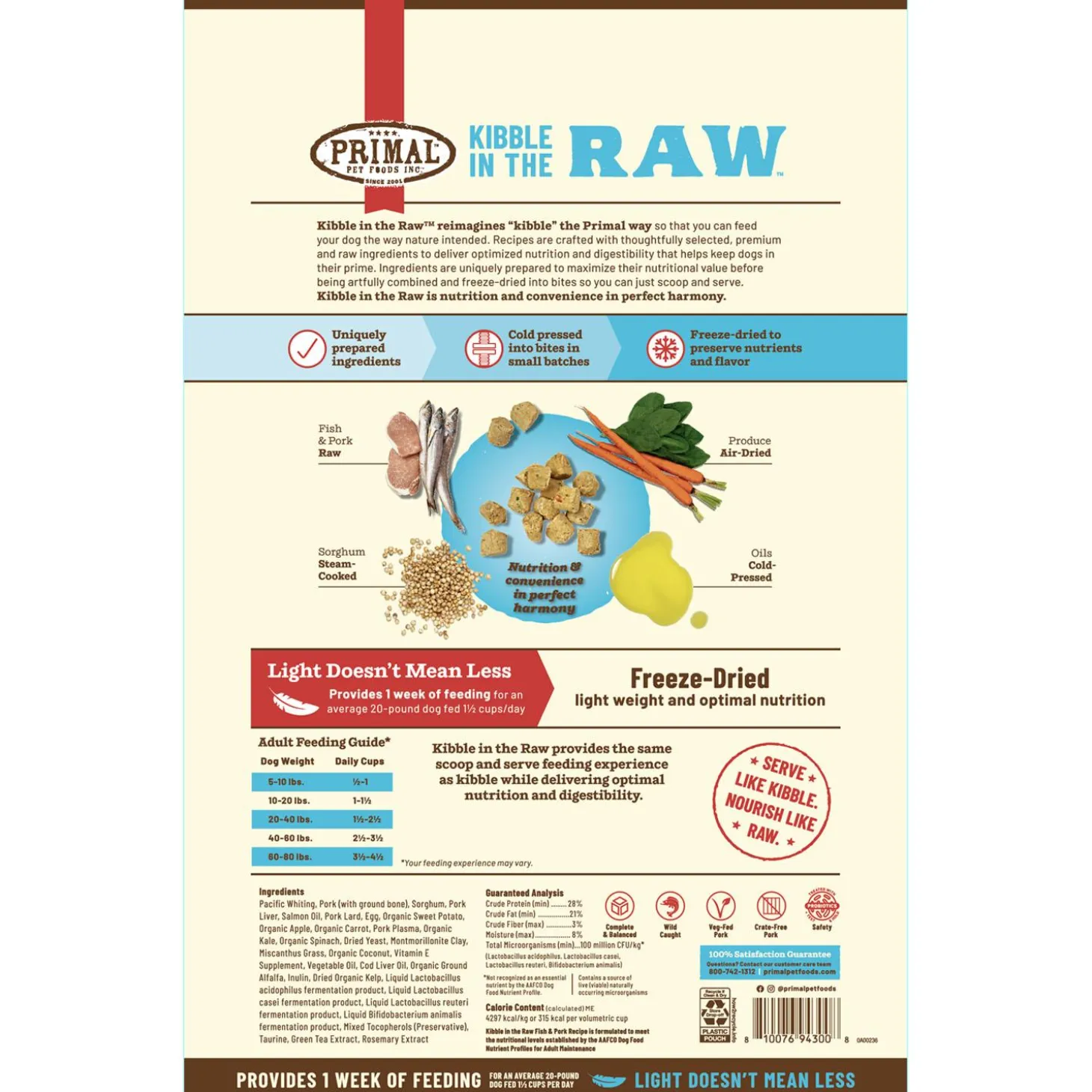 Primal Kibble in the Raw Fish & Pork Recipe Adult Dog Food has nutrition & convenience in perfect harmony! Kibble in the Raw reimagines “kibble” the Primal way so that you can feed your dog the way nature intended. Recipes are crafted to nourish like raw with thoughtfully selected, premium ingredients for optimized nutrition and digestibility, and serves like kibble with an easy scoop-and-serve format.