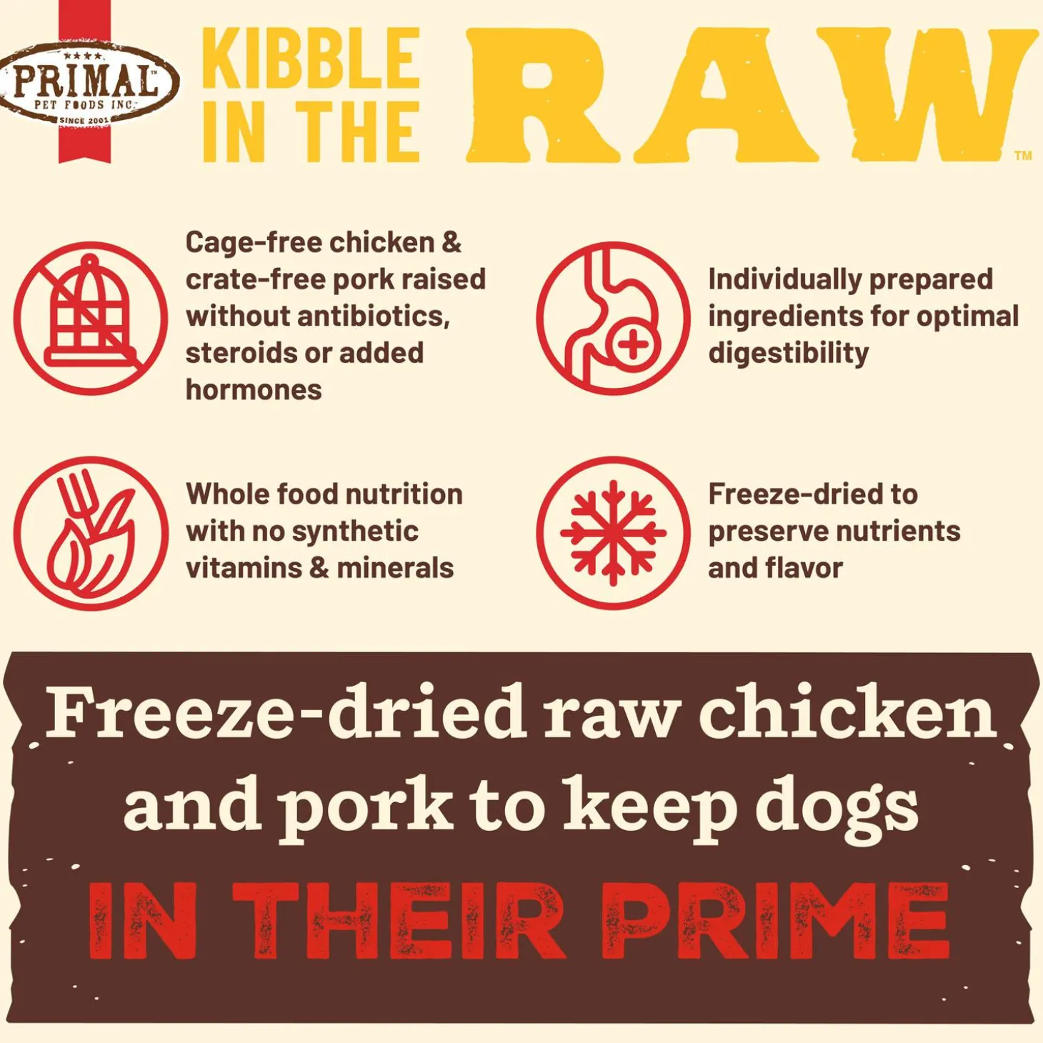 Primal Kibble in the Raw Puppy Recipe Dog Food has nutrition & convenience in perfect harmony! Kibble in the Raw reimagines “kibble” the Primal way so that you can feed your dog the way nature intended. Recipes are crafted to nourish like raw with thoughtfully selected, premium ingredients for optimized nutrition and digestibility, and serves like kibble with an easy scoop-and-serve format.