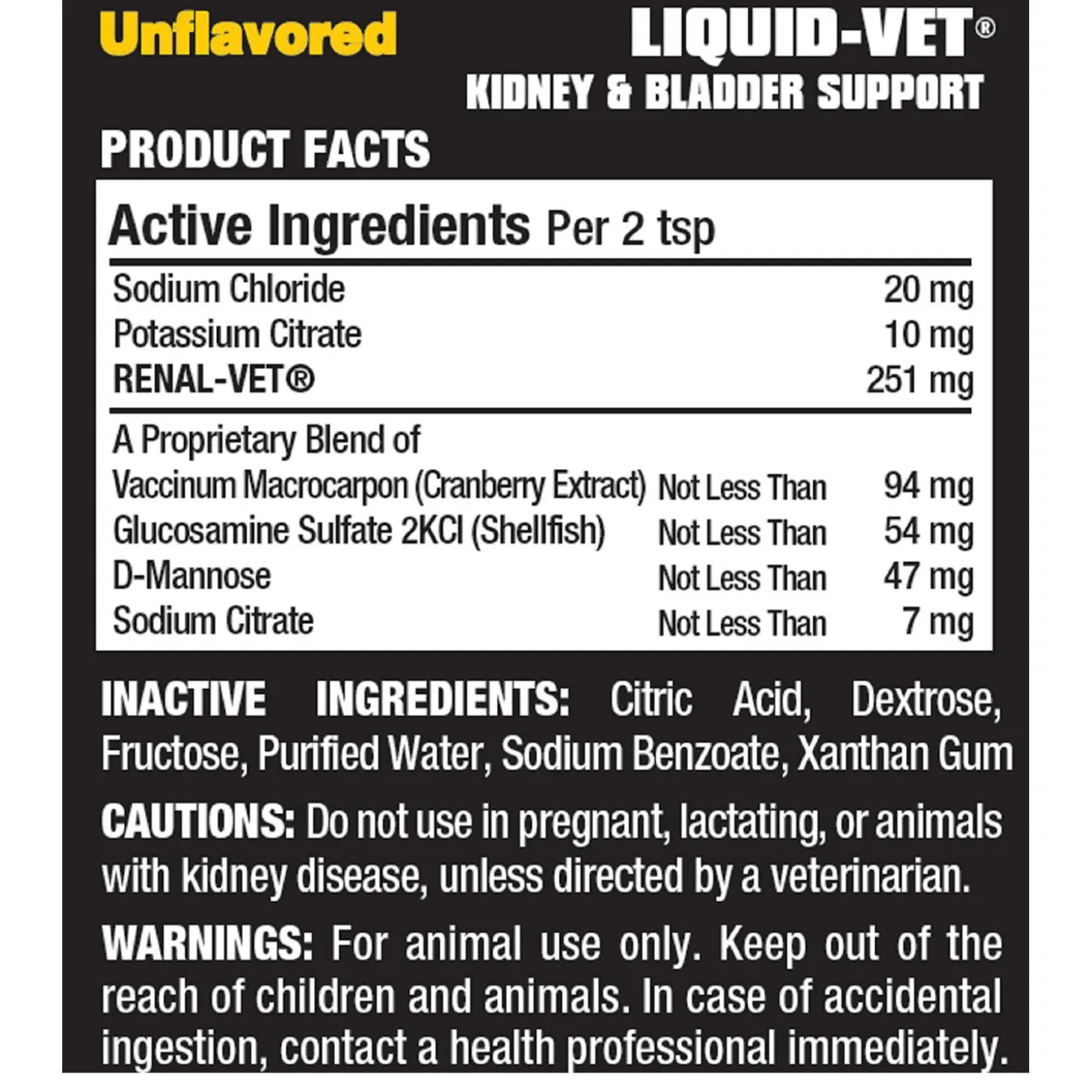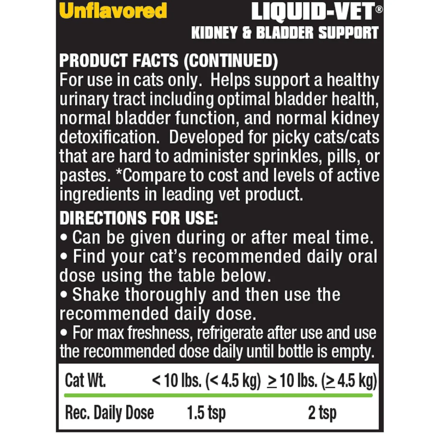 Liquid-Vet Kidney & Bladder Support Unflavoured Cat Supplement contains high levels of glucosamine, d-mannose, electrolytes, and cranberry extract in a single dose and are tastier, easier to use, and faster than pill, powder, or paste supplements. Quickly rehydrates and stimulates your cat’s appetite. Simply dose at mealtimes once a day without mixing, it’s that simple!