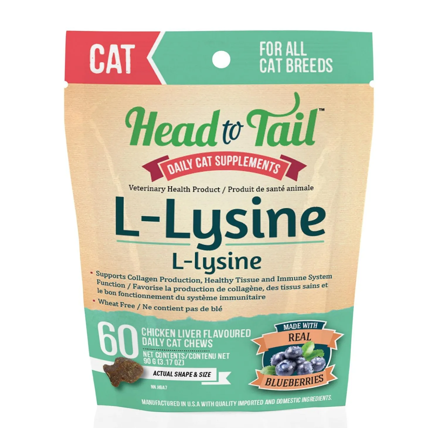 Head to Tail L-Lysine Cat Supplements support your pet’s wellness with essential vitamins, minerals and superfoods packed into tasty, wheat-free chews they can enjoy every day. Formulated to boost overall wellbeing and address common health concerns, Head to Tail Daily Pet Supplements are a great choice for helping pets live healthier lives.