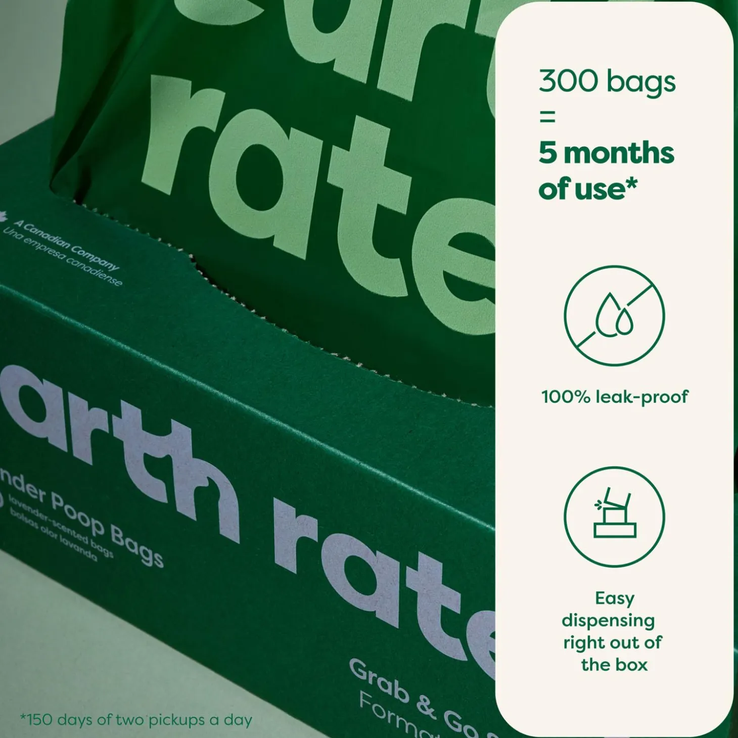 - A BETTER POOP BAG: Earth Rated make their dog poop bags with 65% certified post-consumer recycled plastic, giving a second life to over 5 million pounds/2.2 million kg of landfill-bound plastic a year.
