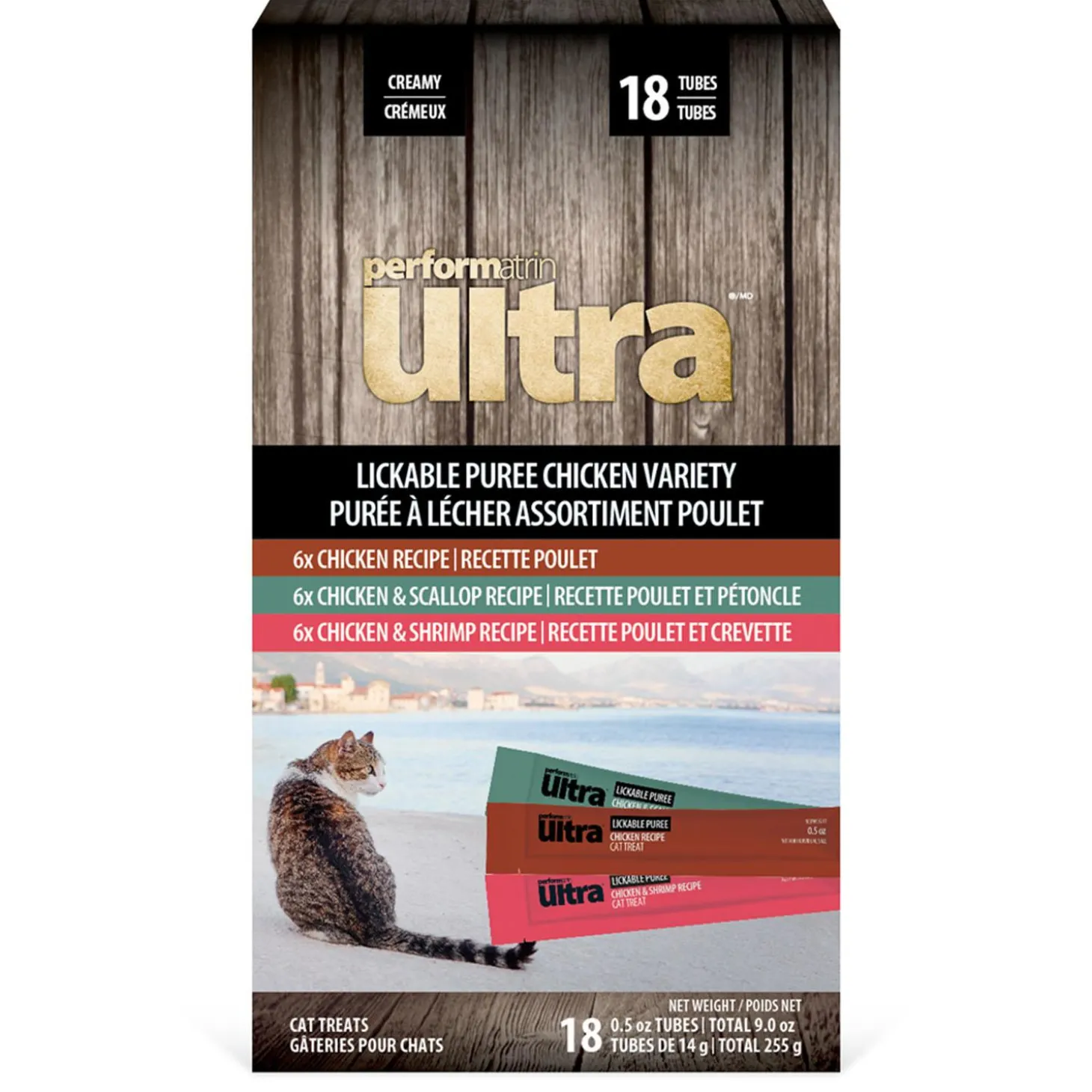 Performatrin Ultra Lickable Chicken Variety Pack Cat Treats are high protein and low-calorie cat treats. These natural and versatile treats are a great way to interact with your pet. Tear open a tube, squeeze to hand-feed or freeze it to feed as a popsicle. Add them as a topper to encourage your fussy eater to finish their meal. High Moisture content in these treats make it a healthy addition to your pet’s daily diet.