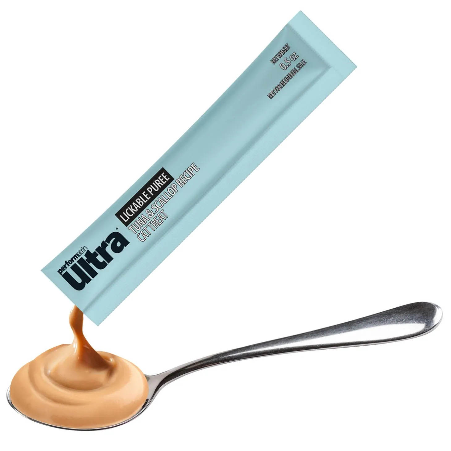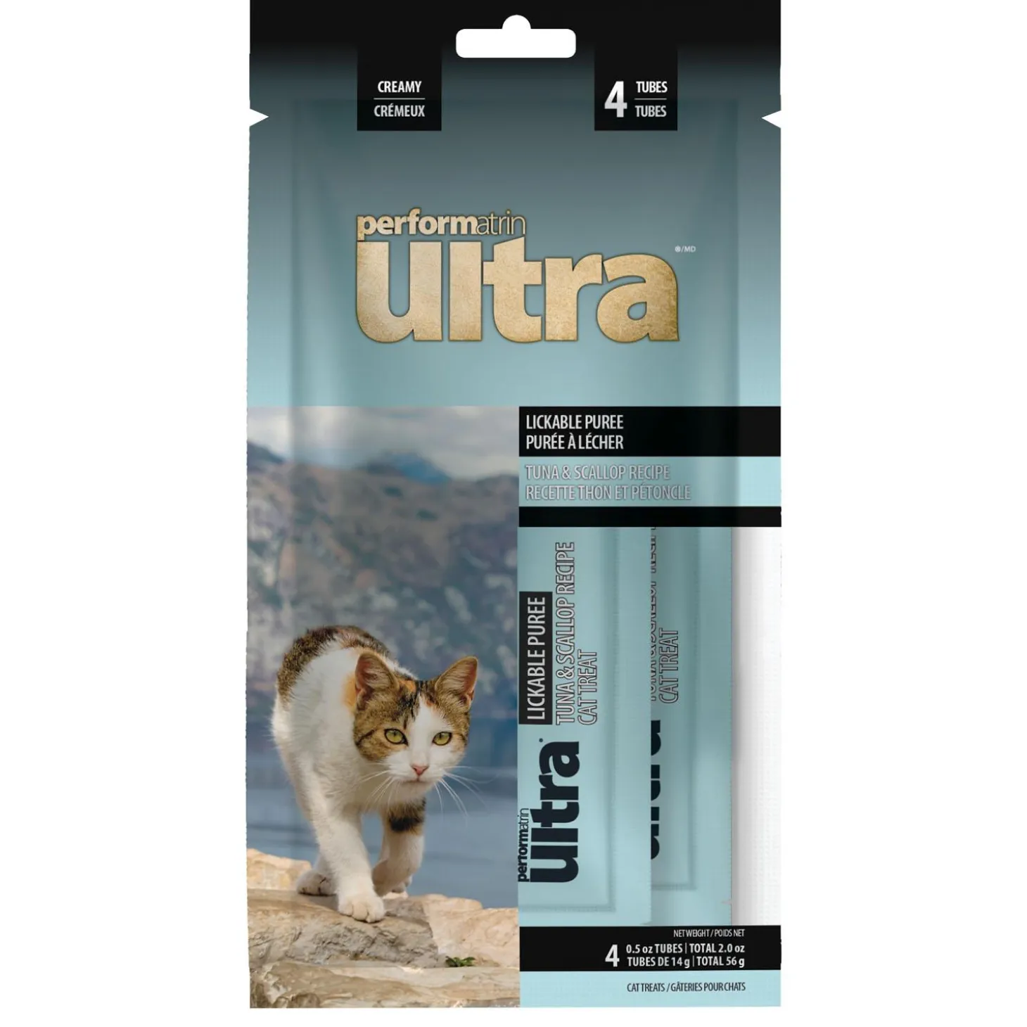 Performatrin Ultra Lickable Tuna & Scallop Puree Cat Treats are high protein and low-calorie cat treats. These natural and versatile treats are a great way to interact with your pet. Tear open a tube, squeeze to hand-feed or freeze it to feed as a popsicle. Add them as a topper to encourage your fussy eater to finish their meal. High Moisture content in these treats make it a healthy addition to your pet’s daily diet.