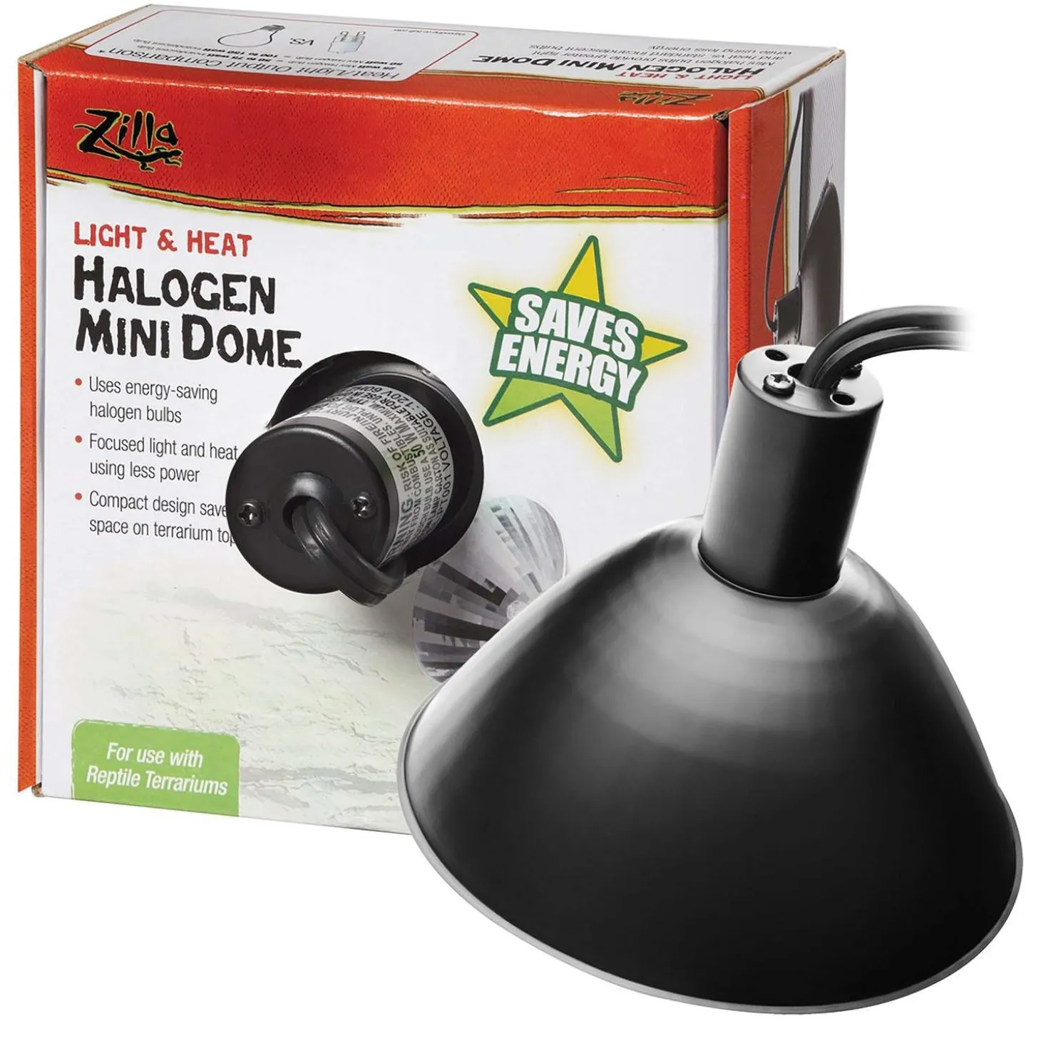 Zilla Light & Heat Halogen Mini Dome provides a convenient alternative to regular domes. Smaller in size, it takes up less space on a terrarium top but still packs a powerful heat and light punch. Each unit comes with a reflective aluminum interior, spring mounting clip to keep dome in place and a 6 ft. power cord with on/off switch.