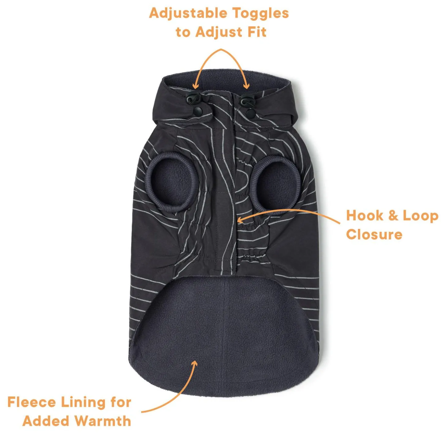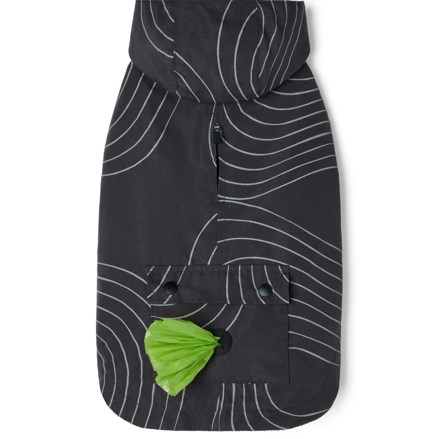 Bailey & Bella Light Reflective Charcoal Jacket provides a versatile lightweight outerwear option to keep your dog comfortable, warm and dry. Designed to shield your pets from inclement weather with a generous adjustable neckline, detachable hood, and fleece lining for added warmth. The reflective pattern provides added visibility in low light conditions, an asset during fall and winter walks. Complete with a functional pocket and poop bag dispenser, this jacket enhances your pet’s outdoor style and comfort to help you enjoy getting outside in all seasons. There’s no such thing as bad weather when you have the right gear!