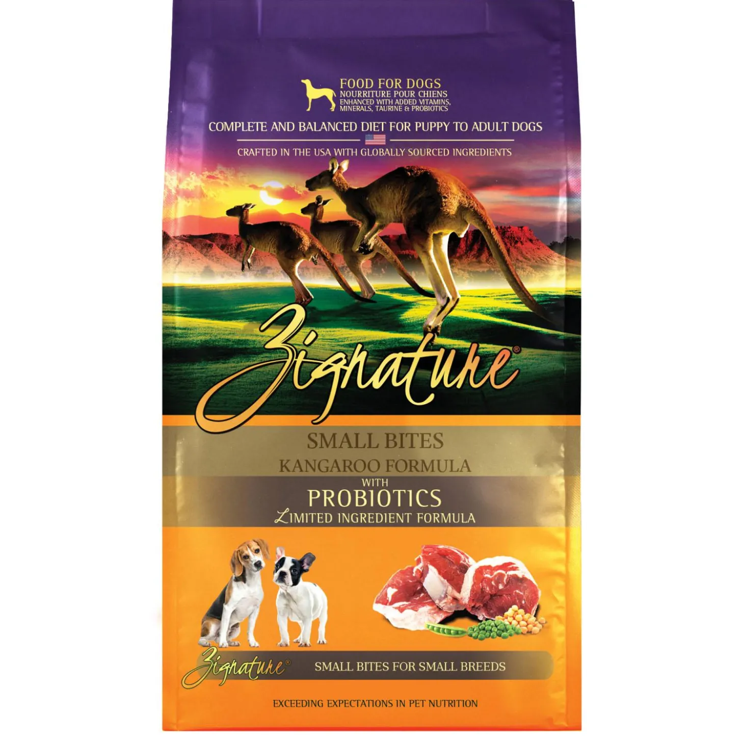 Zignature Limited Ingredient Kangaroo Formula Small Bites Dog Food is for smaller pups! This Kangaroo Formula is packed with lean Kangaroo protein which is rich in nutrients and has twice the amount of Vitamin B12 than any other meat protein. Top that off with other healthy and wholesome ingredients to provide your pup with a tasty and well-balanced diet.