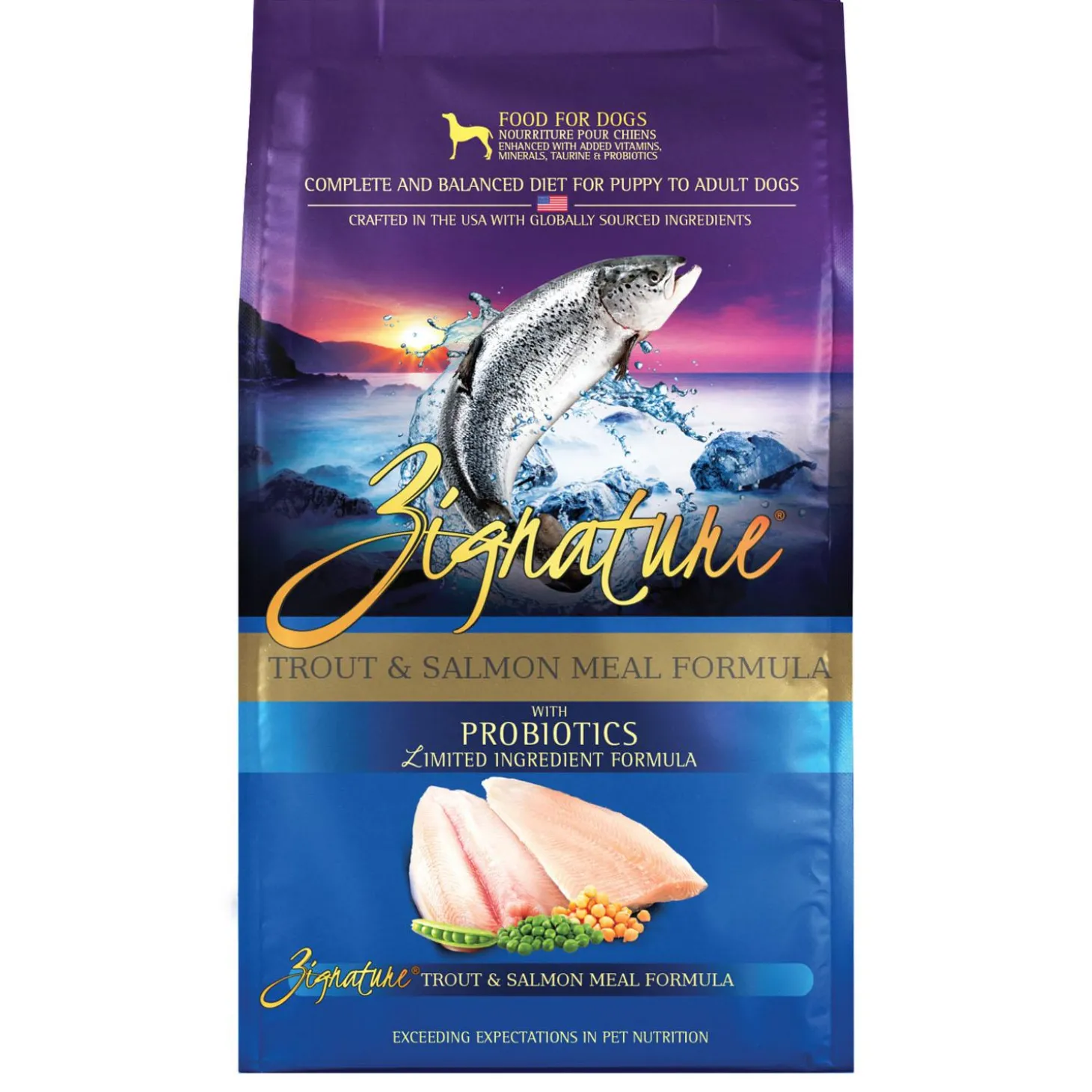 Zignature Limited Ingredient Trout & Salmon Meal Formula Dog Food combines two of the healthiest fish protein sources in the world. Both are high in heart-healthy Omega-3 fatty acids and rich in beneficial minerals like Potassium, Phosphorous and Selenium. Your dog will love this catch.