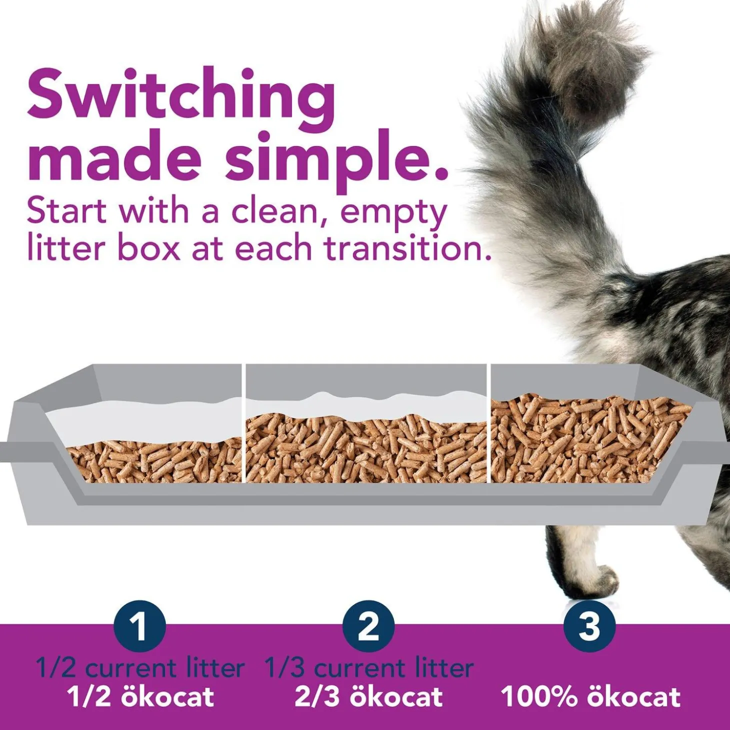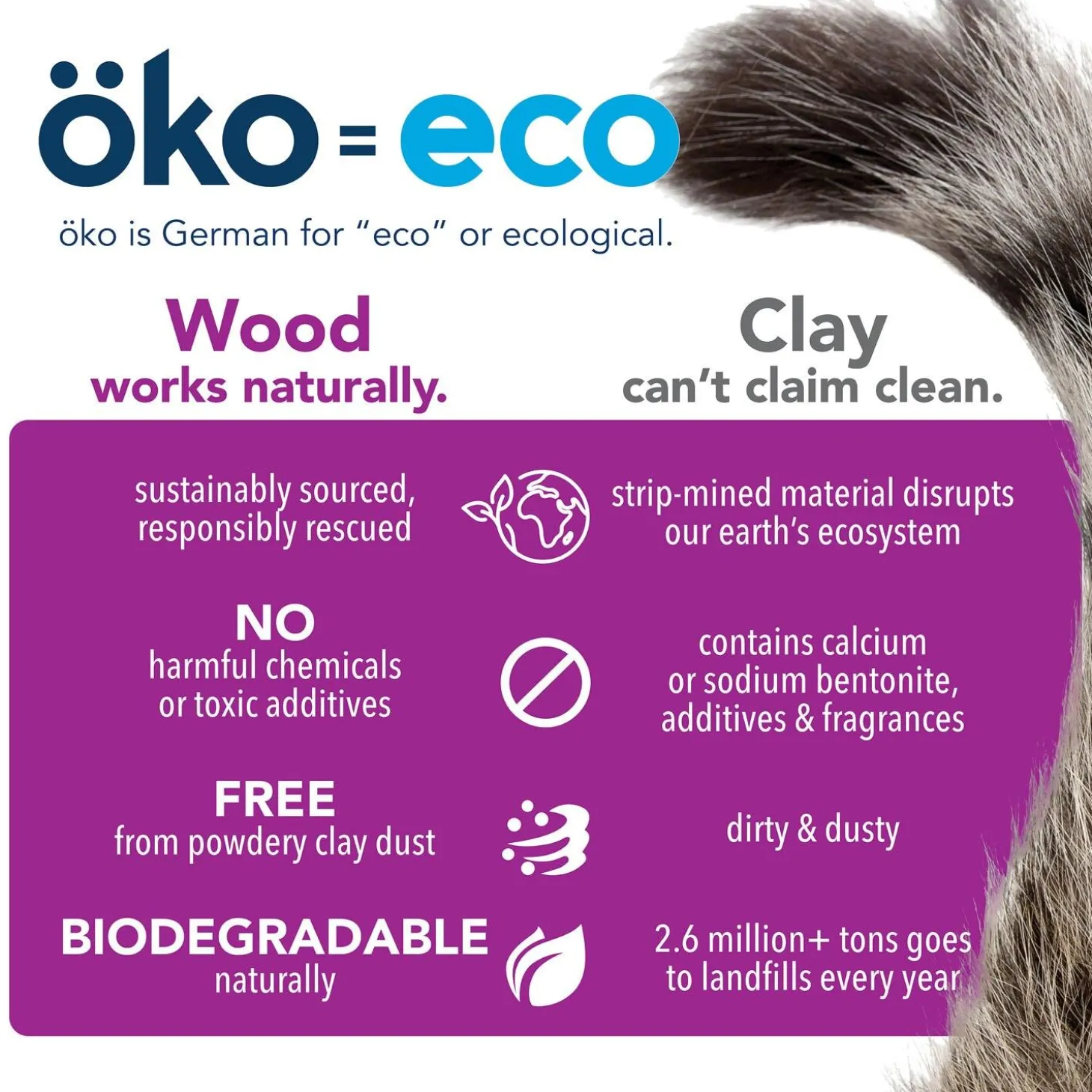 Okocat Low Tracking Clumping Cat Litter will have you spending less time cleaning up litter and more time with your cat. This superior natural litter is cleaner and healthier for your cat, family and home. Okocat low tracking, less mess clumping litter is made from dense, mini-pellets that are soft on paws, less likely to scatter out of the litter box or track through the house like finer litters, and is a great choice for long hair cats. Okocat is relentless at controlling odour, lasts longer because of its fast and furious absorption, and is naturally lightweight for easy lifting, pouring and disposal. Made entirely from sustainably sourced, responsibly rescued natural wood fiber that can safely be returned to the earth, making it biodegradable and flushable all while offering the brilliance of European engineering, so you get a better performing, natural litter