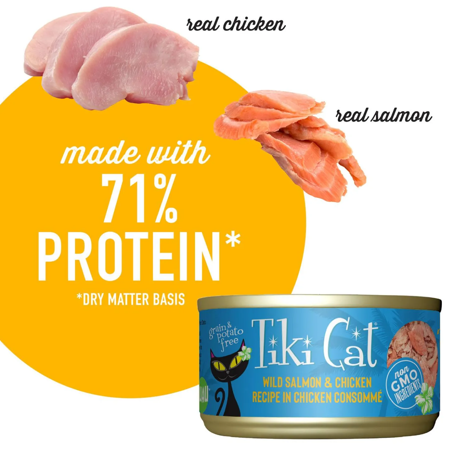 Tiki Cat Luau Wild Salmon & Chicken Recipe in Chicken Consomme Cat Food features a succulent combination of tender shredded chicken and flaked fish in a savoury broth.