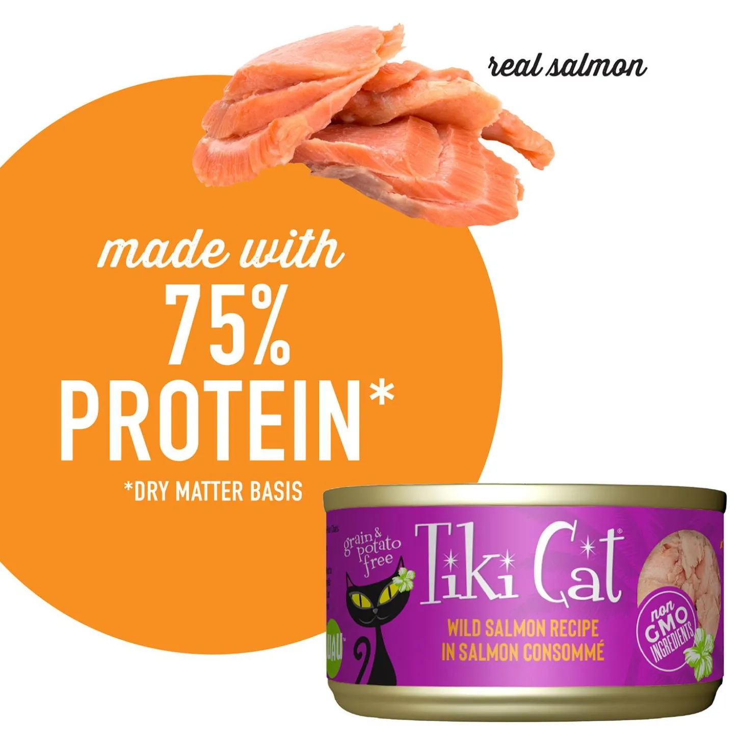 Tiki Cat Luau Wild Salmon Recipe in Salmon Consomme Cat Food features a succulent combination of tender flaked fish in a savoury broth.