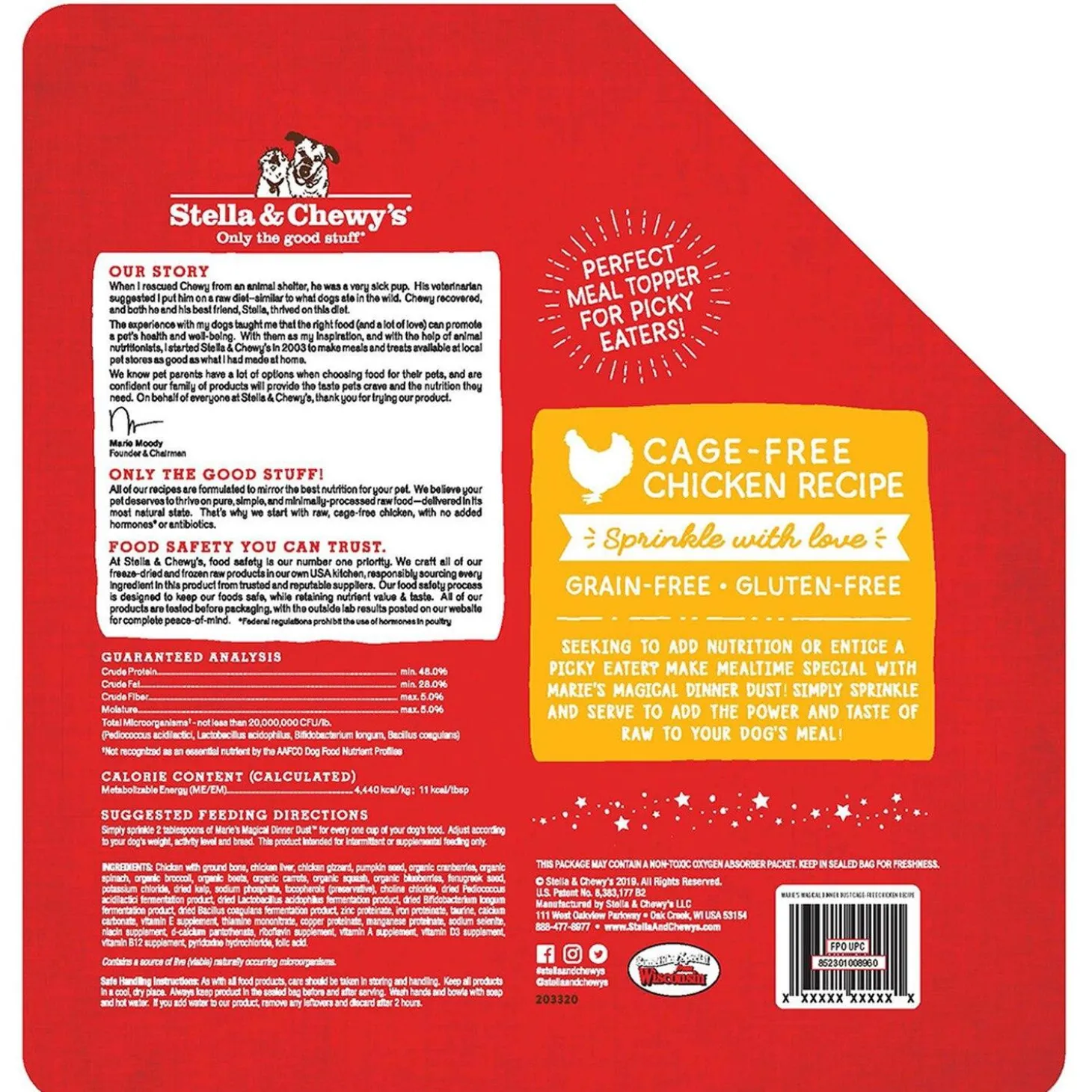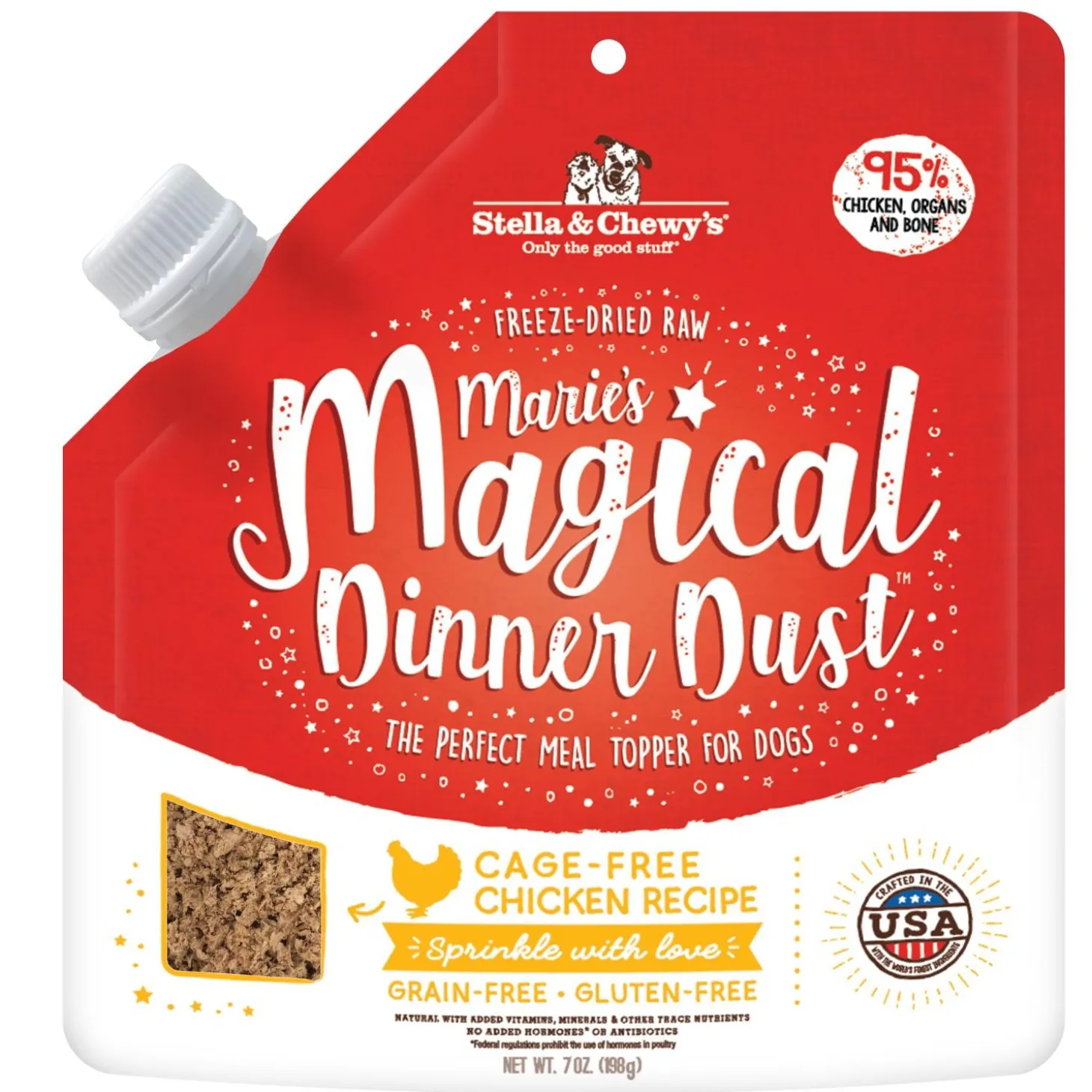 Stella & Chewy’s Marie’s Magical Dinner Dust Cage-Free Chicken is the perfect meal topper for picky eaters, Pea-Free, Lentil-Free, and Potato-Free, Irresistible taste dogs love, Easy pour spout, Sprinkle with love.
