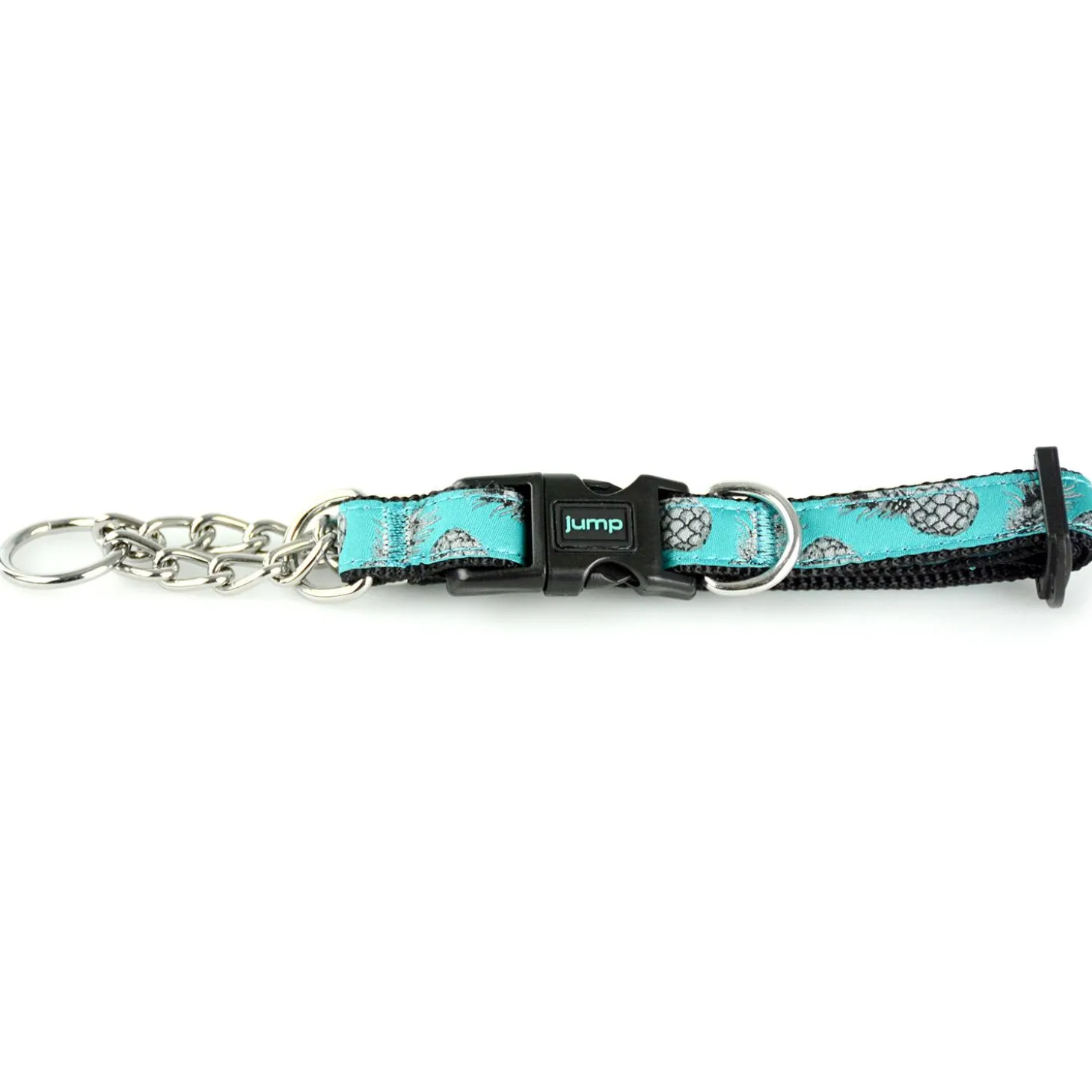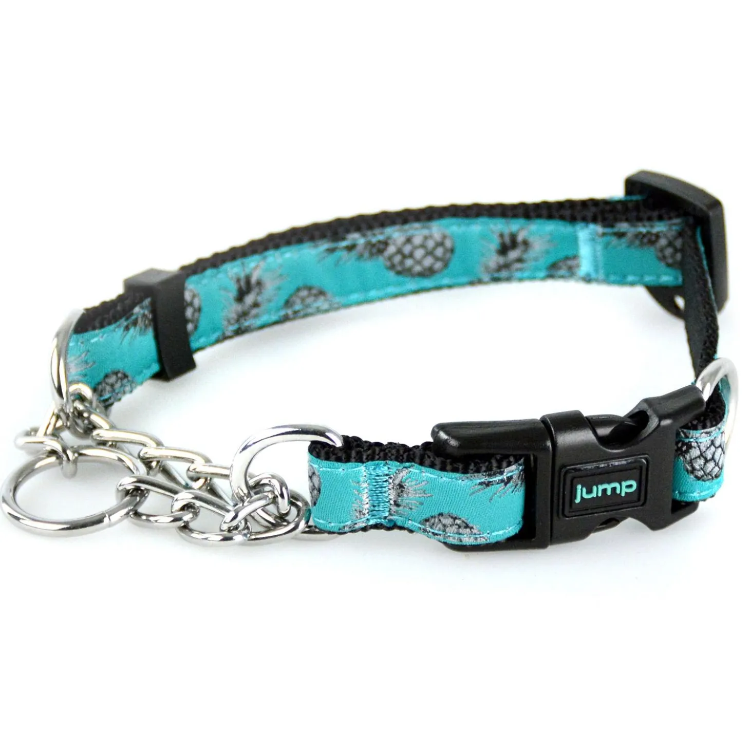 Jump Martingale Teal Pineapple Dog Collar is a safer and comfortable alternative to a choke collar. The self-adjusting chain loop does not overcorrect or cause choking. When the dog pulls away, the martingale will automatically engage, producing an even distribution of pressure from the collar. The click of the chain provides an audible training cue that your dog will react to, which allows you to safely and effectively train your dog. The quick snap buckle enables easy on/off. Made of high quality, durable nylon for a lightweight, comfortable design suitable for everyday wear.