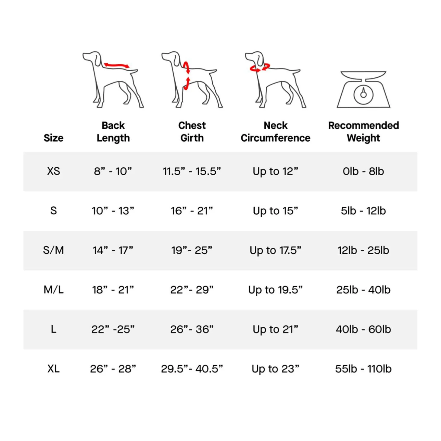 | Pet Size | Back Length | Chest Girth | Neck Circumference | Recommended Weight |