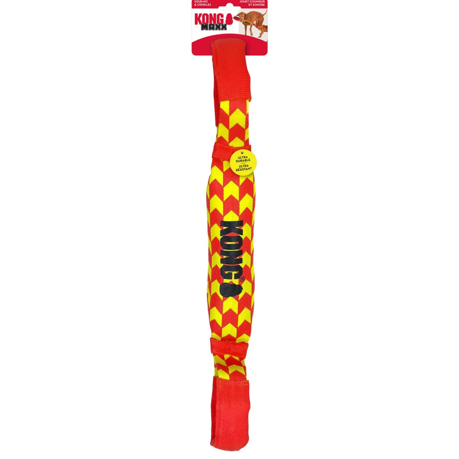 KONG Maxx Tug Dog Toy is rugged, durable, and made for energetic play sessions. This interactive tug toy is engineered for strength, with durable seatbelt material and two padded handles for extreme rounds of tugging, thrashing, and fetching. Inner crackle material and a squeaker keep dogs engaged for extended play sessions. Up to 5x stronger than typical plush toys, this tug is made for extreme fun.