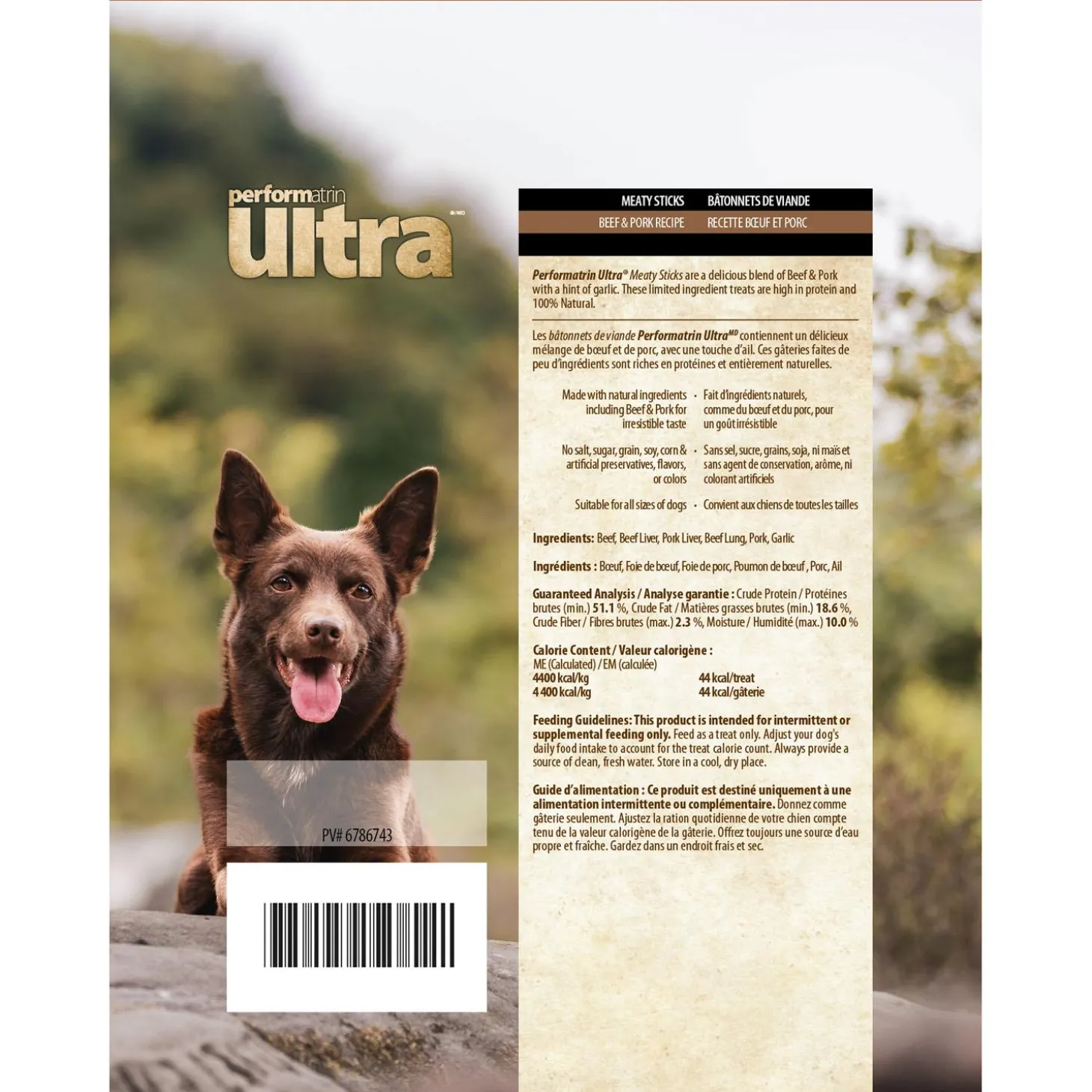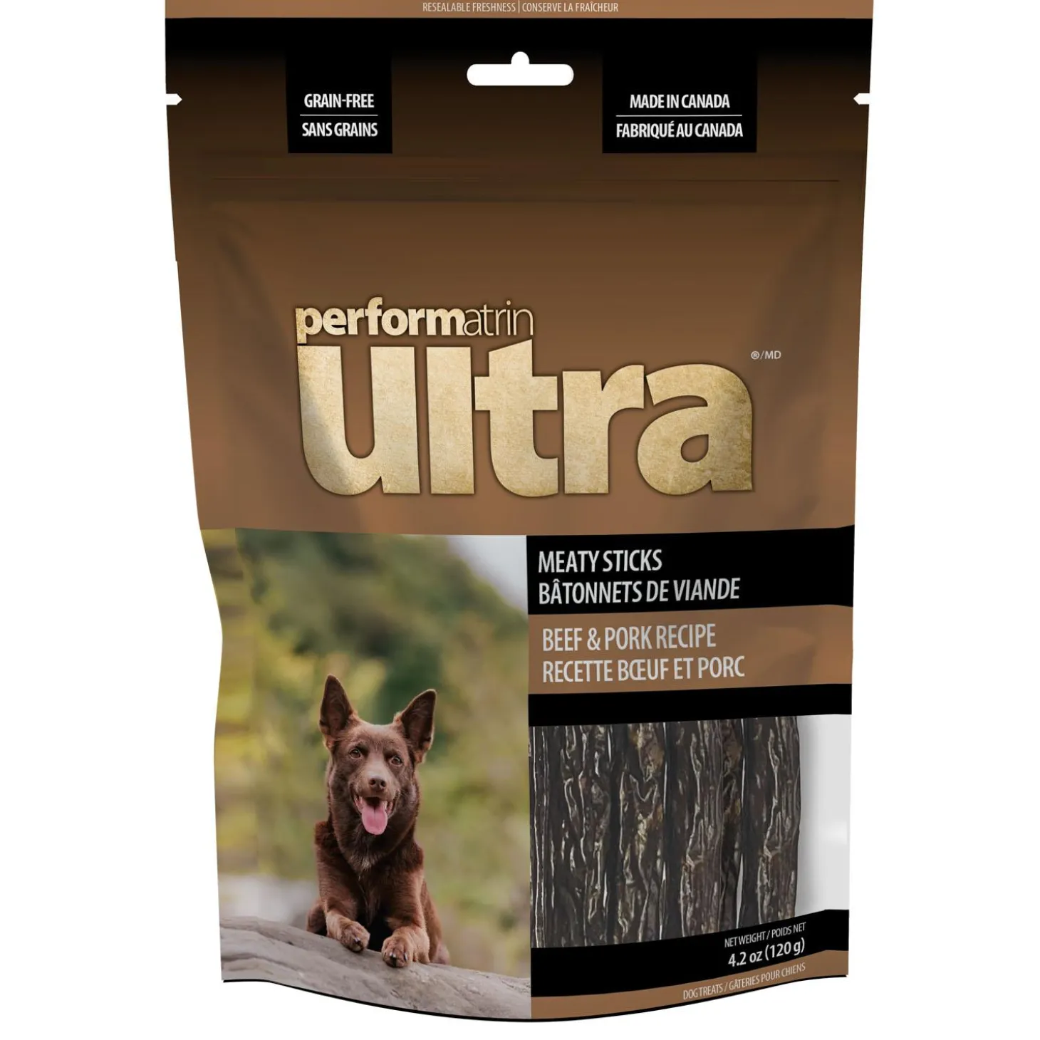 Performatrin Ultra Meaty Sticks Beef & Pork Recipe Dog Treats are a delicious blend of Beef & Pork with a hint of garlic. These limited ingredient treats are high in protein and 100% Natural