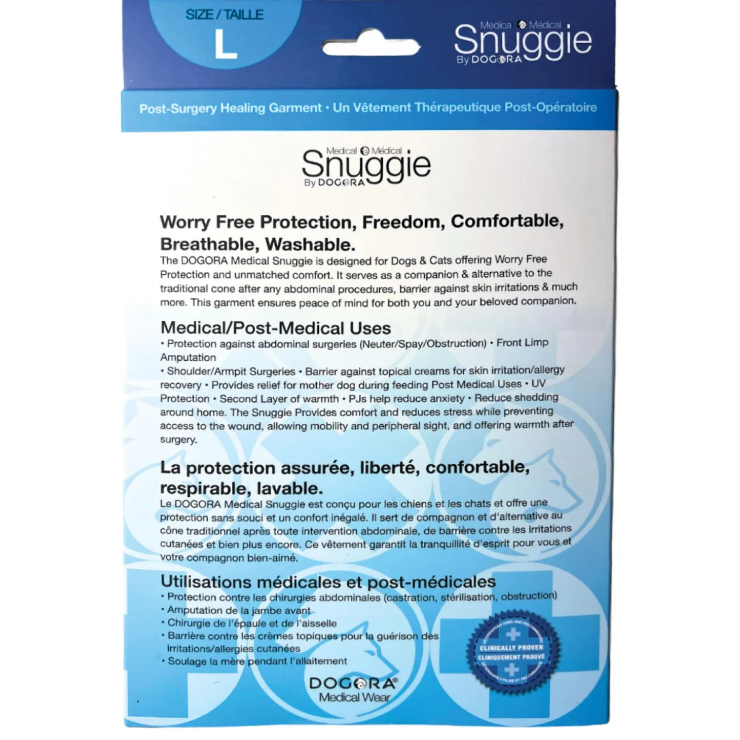 DOGORA Medical Snuggie Onesie is designed for dogs & cats offering worry free protection and unmatched comfort. It serves as a companion & alternative to the traditional cone after any abdominal surgeries such as neuters, spays, trunk related surgeries, front limb amputations and a barrier from any topical creams when recovering from skin irritations/allergies i.e. hot spots. This garment ensures peace of mind for both you and your beloved companion.