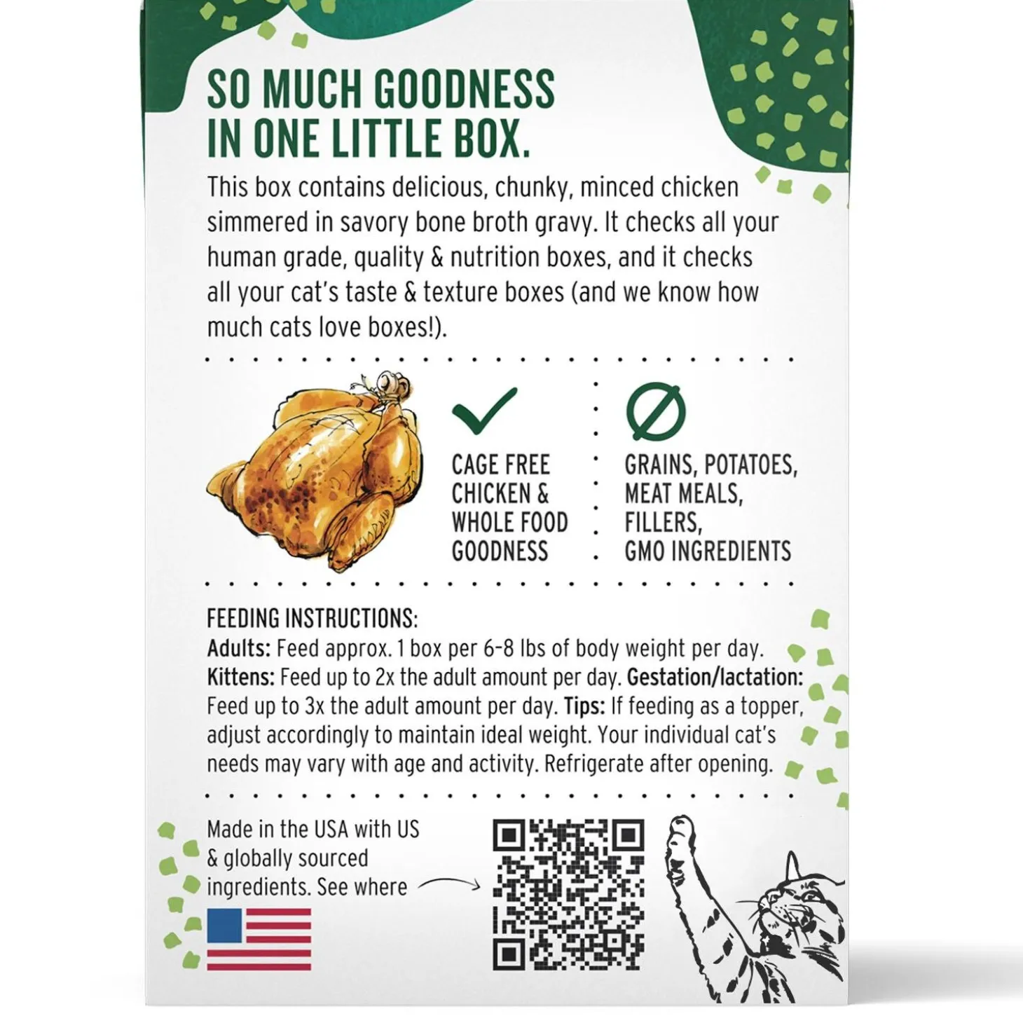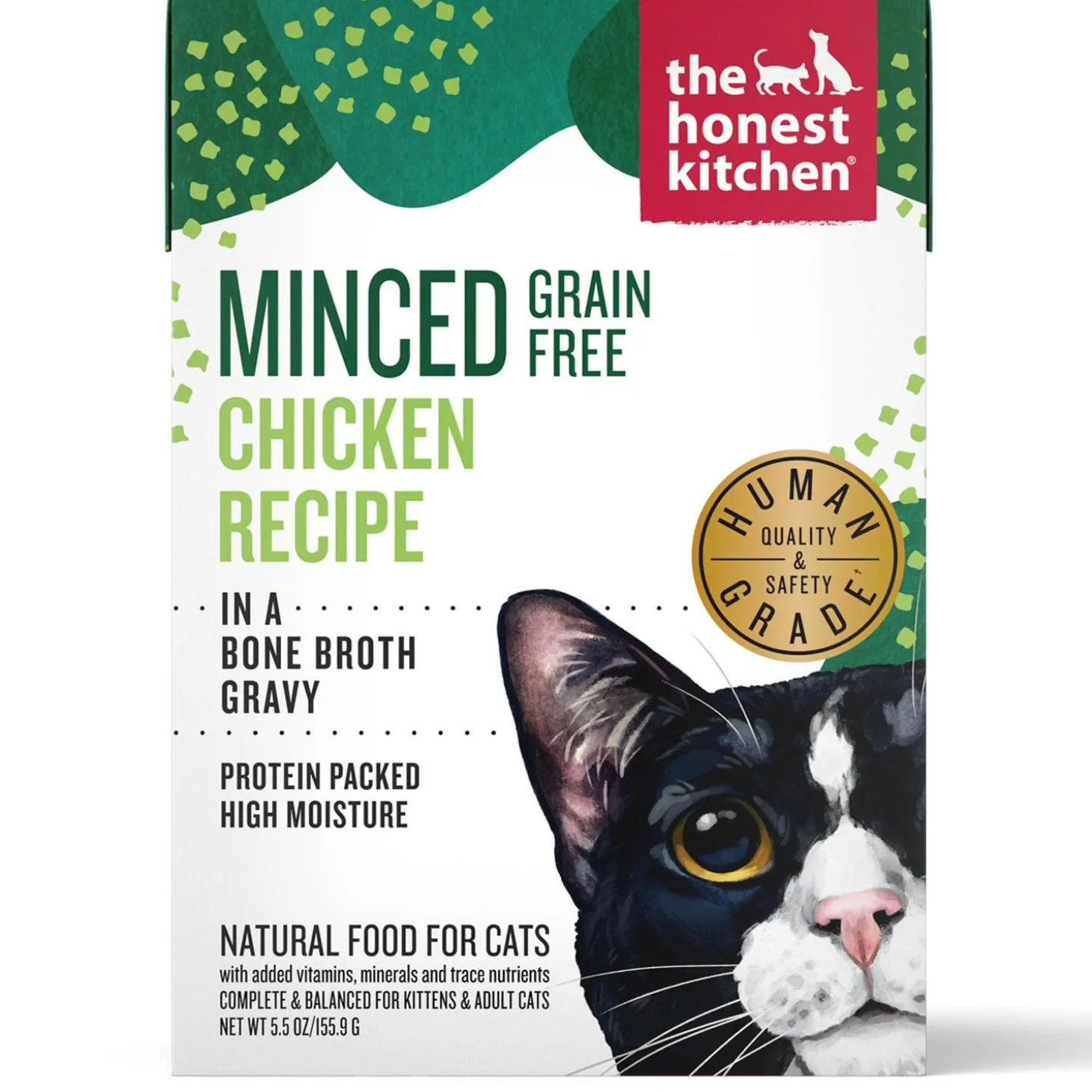 Honest Kitchen Minced Chicken in Bone Broth Gravy Recipe Cat Food contains delicious, chunky, minced cage free chicken simmered in savory gravy. This 100% human grade recipe checks all your human grade, quality & nutrition boxes, and it checks all your cat’s taste & texture boxes.