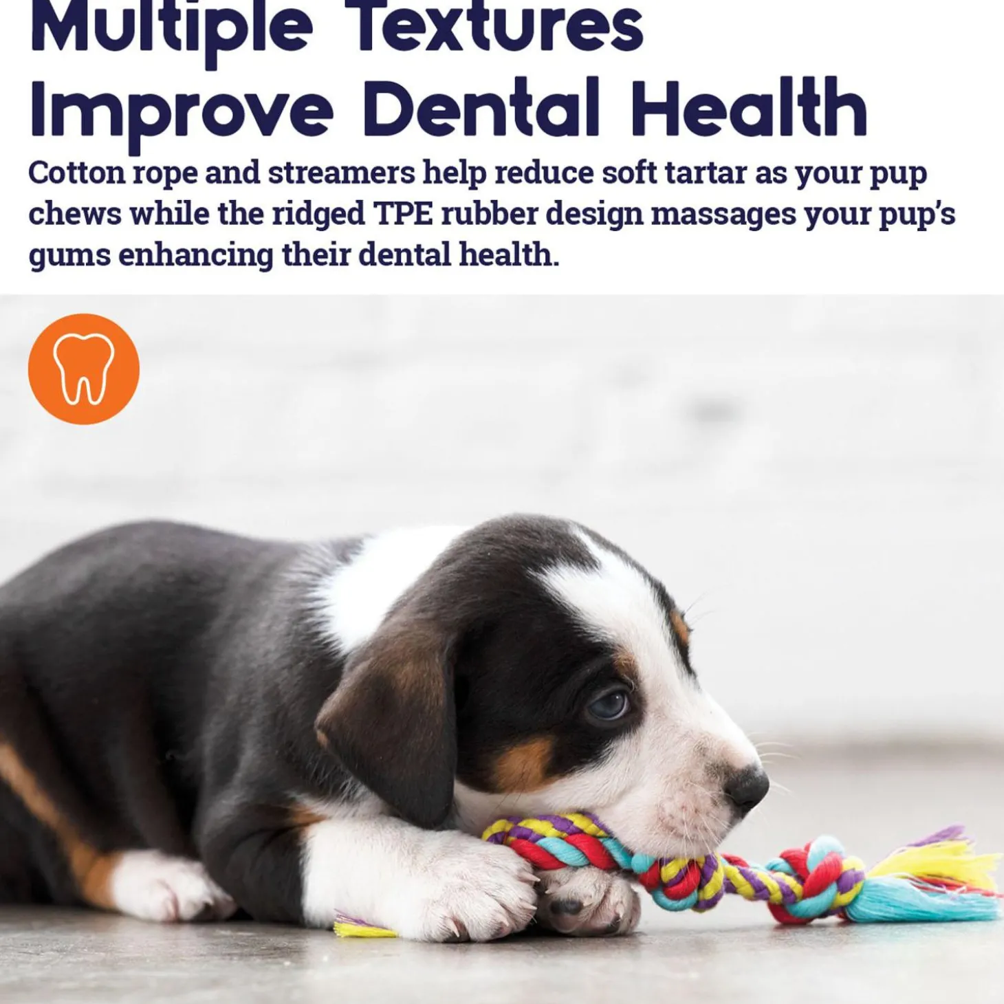 - Multiple Textures Improve Dental Health: Cotton rope and streamers help reduce soft tartar as your pup chews while the ridged TPE rubber design massages your pups gums enhancing their dental health.