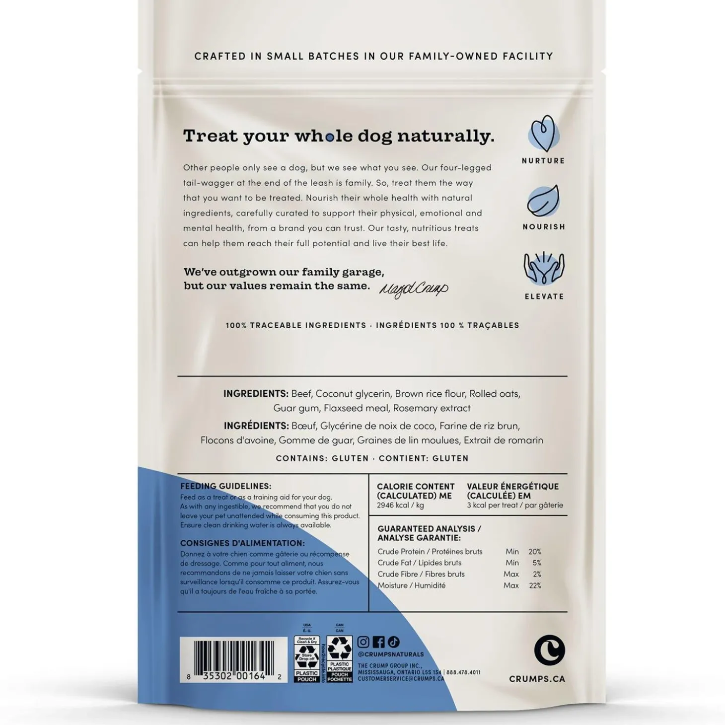 Crumps’ Naturals Mini Trainers Beef Dog Treats are made with premium North American beef. These soft and chewy high protein training treats are perfect for dogs of all ages and sizes. Each delicious bite sized piece has 3 calories making it the ideal low calorie solution for repetitive rewards training. These Mini Trainers are irresistible and all natural, crafted in small batches in our family-owned facility with no artificial colours, flavours or preservatives. Keep your pup motivated and fuel their potential with Crumps’ Naturals Semi-Moist Beef Mini Trainers.