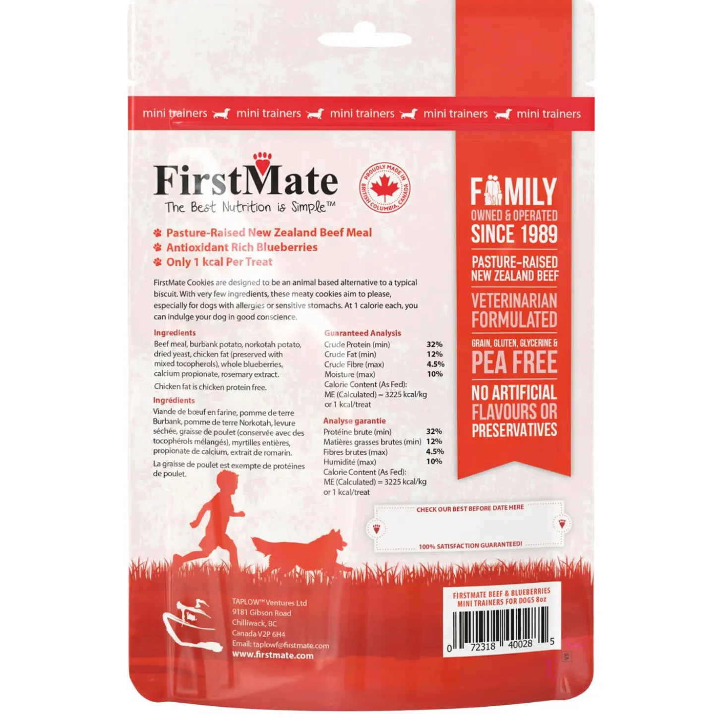 FirstMate Mini Trainers New Zealand Beef Meal & Blueberries Cookies Dog Treats are Limited Ingredient treats with only 1 kcal per treat. Great for small mouths and long training sessions. These high reward treats are designed to be a meat based alternative to a typical biscuit. This grain, glycerine, and pea free formula is ideal for everyday use as a treat or training aid for your dog.