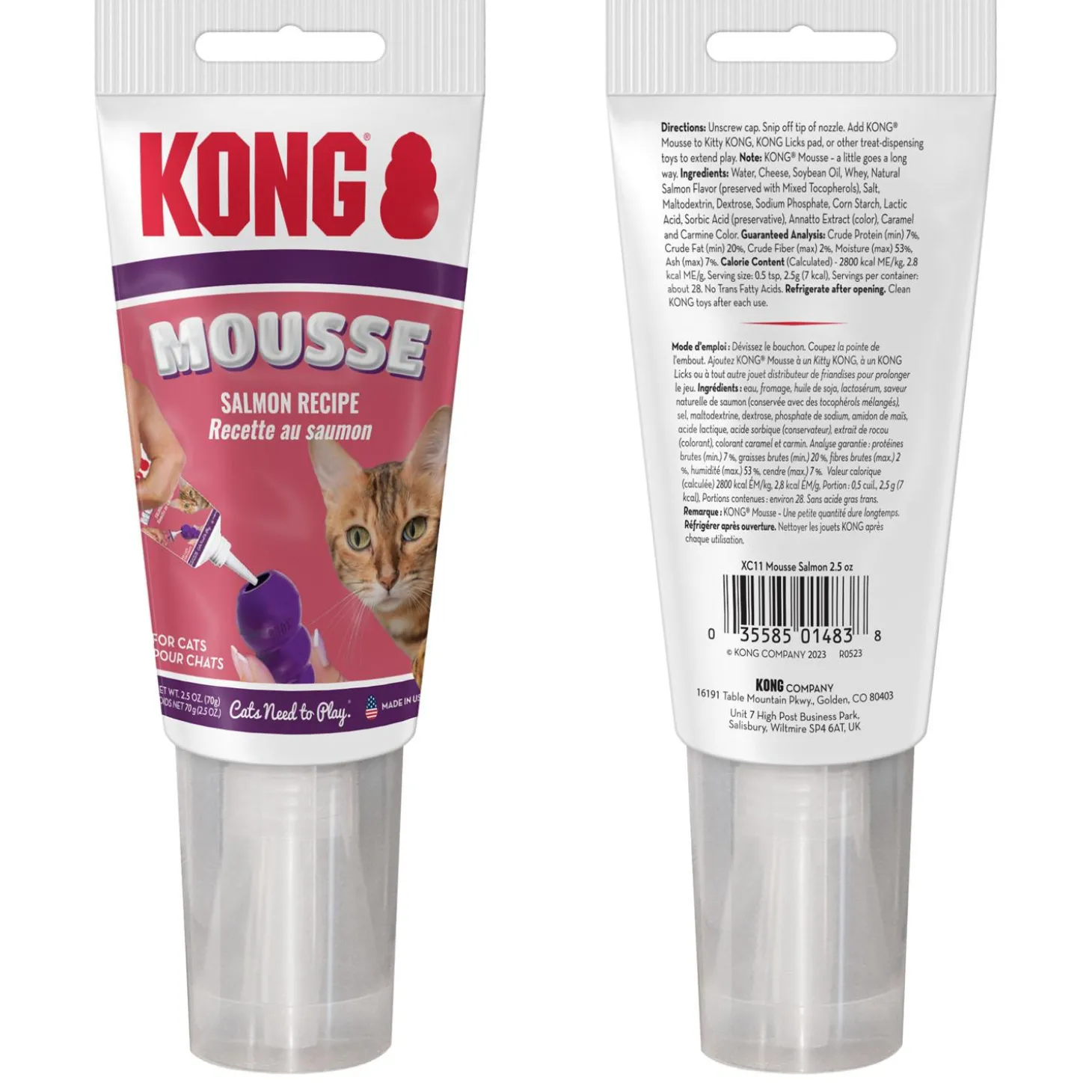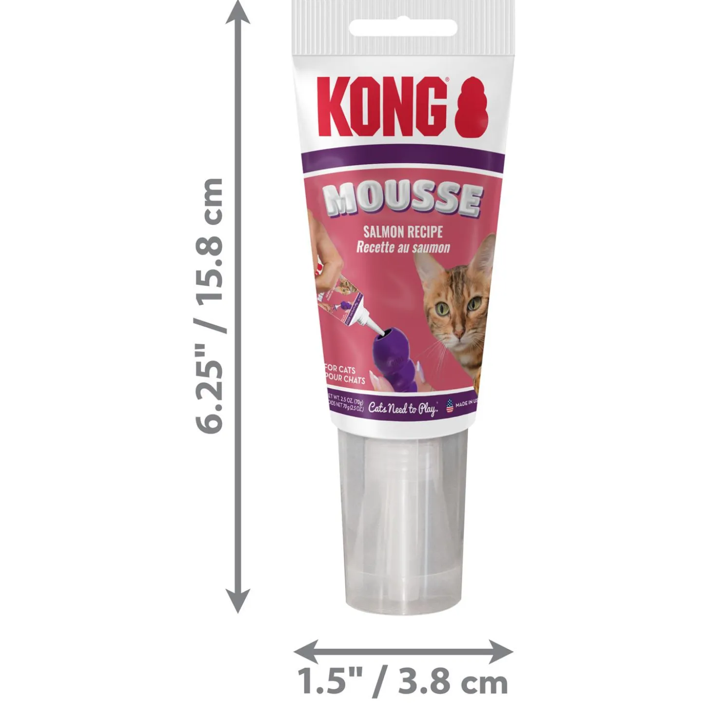 KONG Mousse Salmon Recipe Cat Treat is a delicious paste that delights cats and makes stuffing Kitty KONG easy with its nifty, no-mess nozzle. Use with KONG Licks pad or other treat-dispensing toys for a delicious diversion. Refrigerate after opening. Entice and delight cats with KONG Mousse, packaged with a convenient, mess-free nozzle that makes it easy to use with treat-dispensing toys for instinct-satisfying play.