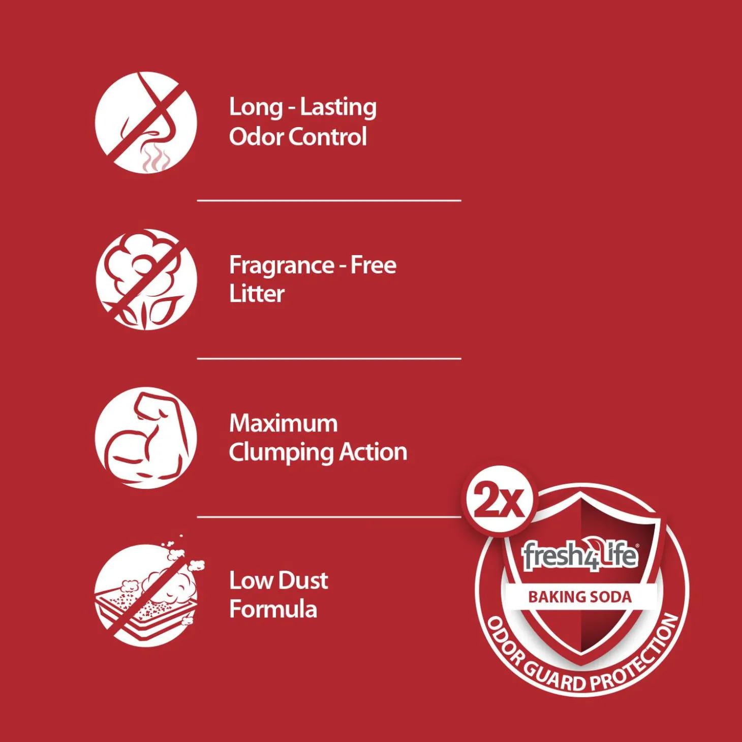 Fresh 4 Life Multi-Cat Clumping Cat Litter is formulated with double the Baking Soda Odour Guard Protection of Fresh 4 Life Clumping Cat Litter. This fragrance-free litter provides long-lasting odour control with maximum clumping action, keeping your home fresh and clean.