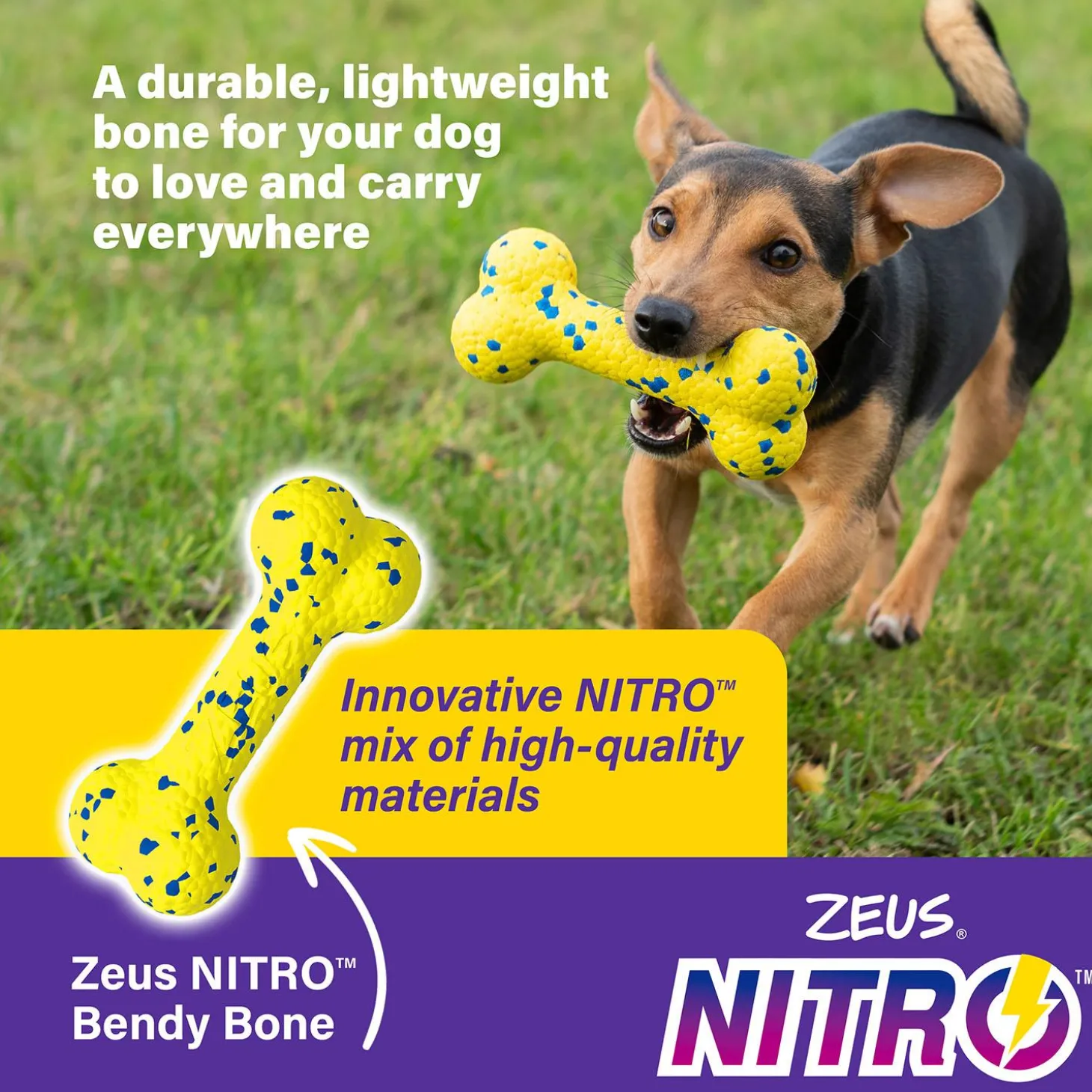 Zeus NITRO Bendy Bone Dog Toy is a durable, lightweight bone for your loyal canine to love and carry with them day in, day out. Made of a high-quality NITRO mix, this toy is soft on dog’s teeth while also being highly flexible and very bouncy.