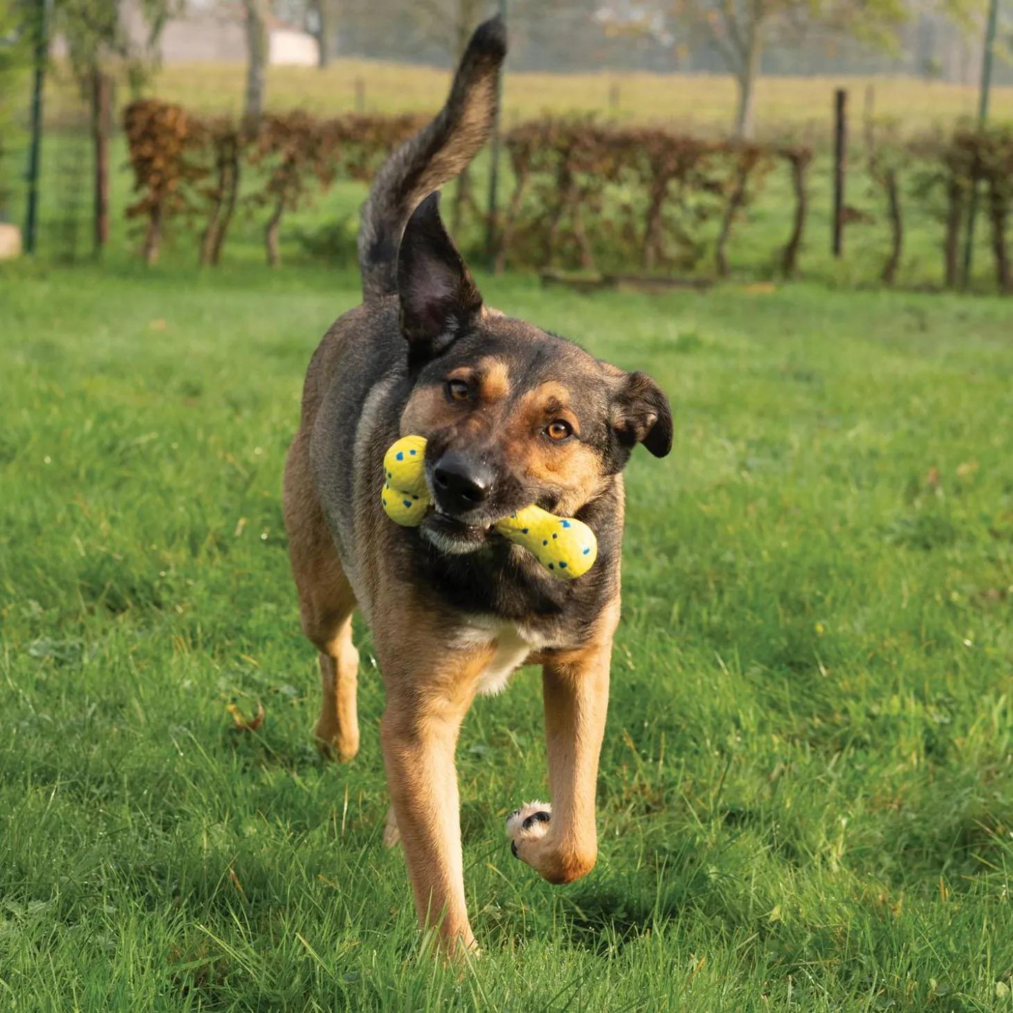 - Vibrant yellow colour with blue speckles allows dogs to easily spot and retrieve in any environment