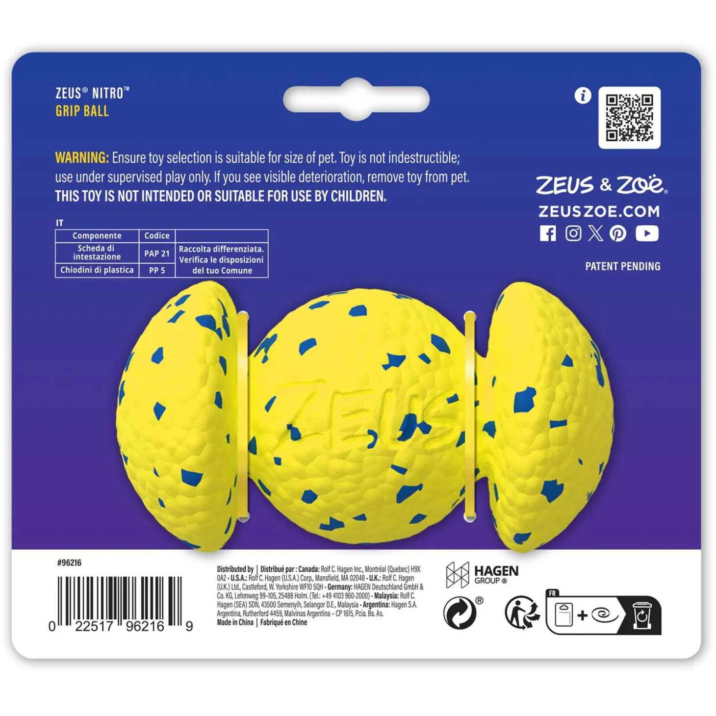 Zeus NITRO Weighted Grip Ball Dog Toy introduces a playful, unpredictable bounce to your play sessions. The weighted natural rubber core increases throwing distance and the winged design prevents choking hazards while also making it easier for you to retrieve the ball from your dog!