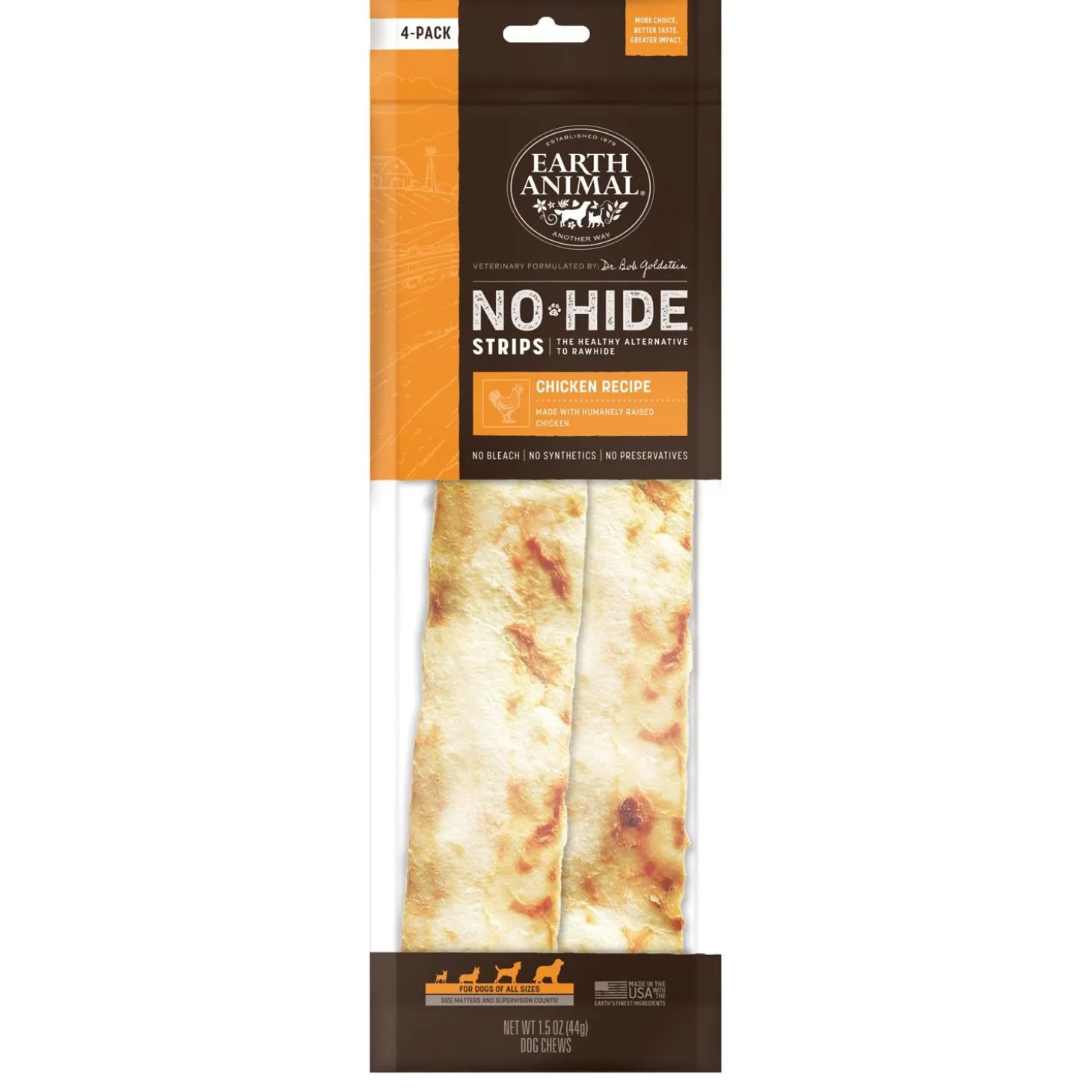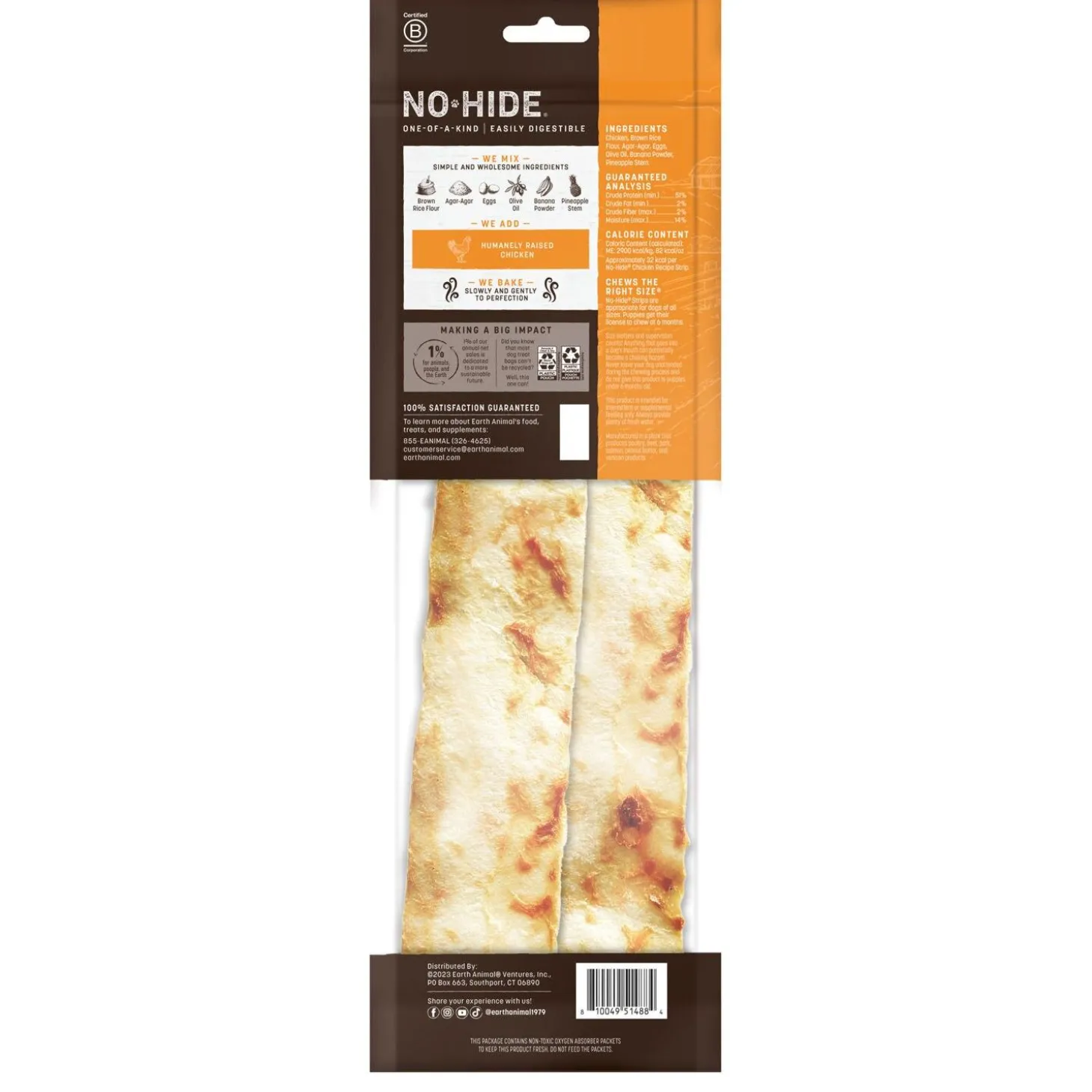 Earth Animal No Hide Strips Chicken Recipe Dog Treats are 100% rawhide free and are proudly made in the USA with Earth’s finest ingredients. You can trust that every choice made is thoughtfully upholds Earth Animals mission to preserve and enhance quality of life for all Earth’s animals. Earth Animal is transparent about how No-Hides are made, their compassionate sourcing, and their selection of ingredients. No-Hides are the healthy alternative to rawhide: no synthetic chemicals, additives, bleaches, or formaldehydes. All No-Hides are packaged by weight, but on average Strips are approximately 11″ long by 2.5″ wide. Earth Animal dedicates 1% of annual net sales to efforts that preserve and enhance quality of life for animals, people, and the Earth.