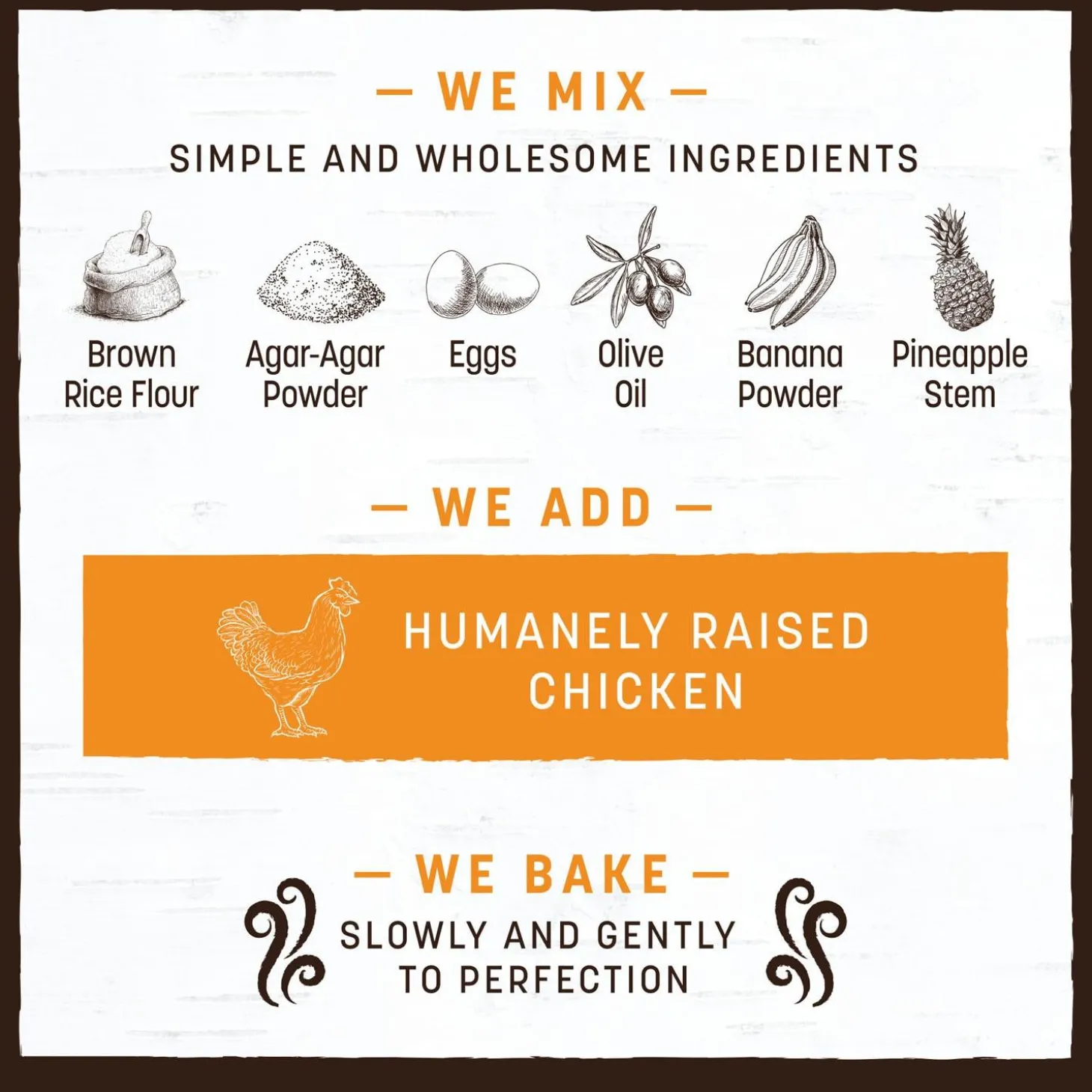 - MADE WITHOUT: No bleach. No synthetics. No foul odor. Each No-Hide starts with simple ingredients – brown rice flour, agar-agar, eggs, olive oil, banana powder, & pineapple stem. After adding a flavorful protein, they’re baked to perfection