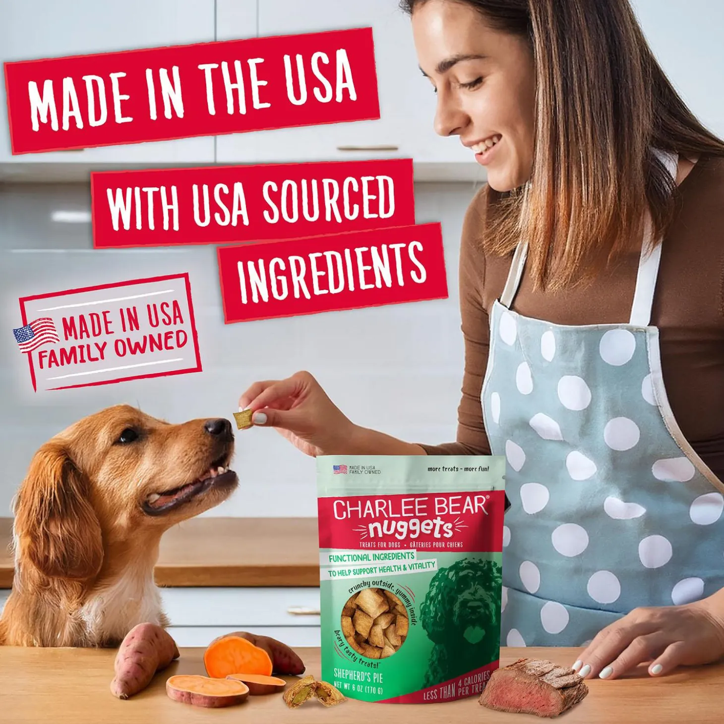 Charlee Bear Nuggets Shepherd’s Pie Dog Treats will indulge your dog’s taste buds. The irresistible functional dog treats that pack a flavour punch in every bite. Charlee Bear Nuggets are low calorie with a soft center and satisfying crunch. Made in the USA with wholesome ingredients dogs love. Charlee Bear Nuggets are the healthy, delicious way to reward your pup. These treats deliver big taste without the guilt, making them perfect for training, rewarding or just because. These nuggets are sure to become your dog’s new favourite.