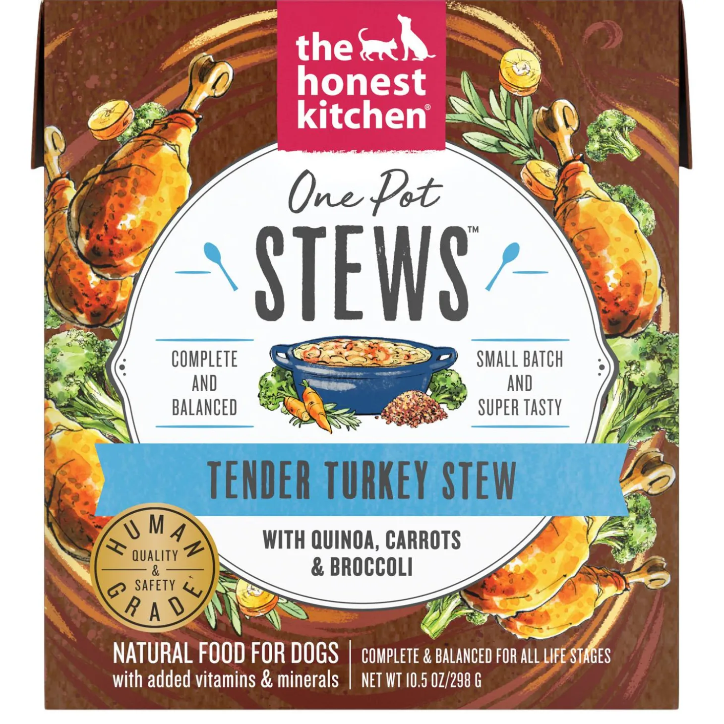 The Honest Kitchen One Pot Stews Tender Turkey Stew Dog Food tempts even the pickiest pups with this chef-crafted, human grade stew that’s been kettle-cooked to lock in flavour. This chunky, hearty stew with cage free turkey, quinoa, carrots, broccoli and a hint of sage can be served as a complete meal or healthy mix-in that helps you boost your pup’s health and happiness from the inside out.