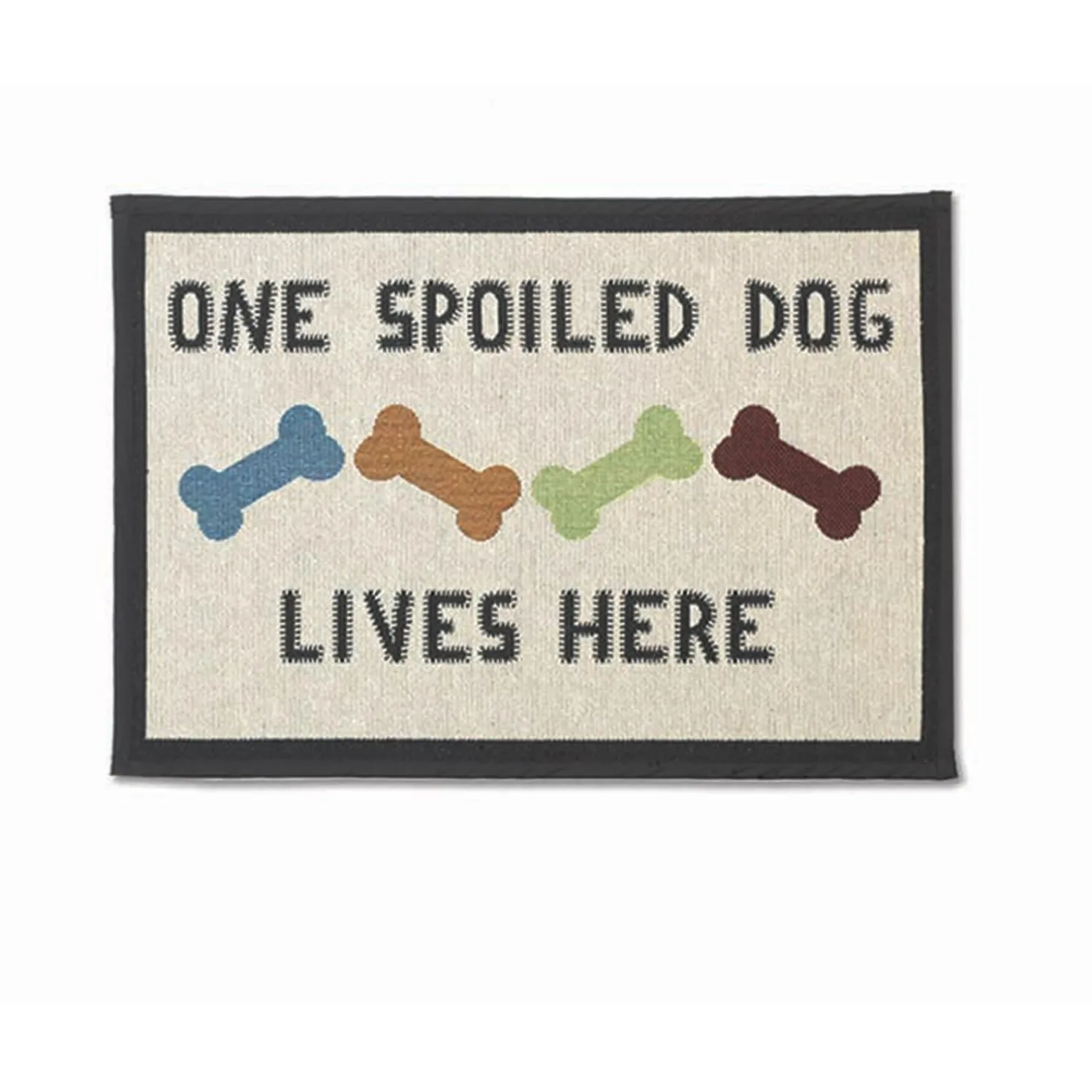PetRageous One Spoiled Dog Lives Here Tapestry Placemat measures 19″ x 13″. It is woven tapestry that features multi-colored bones in the center.