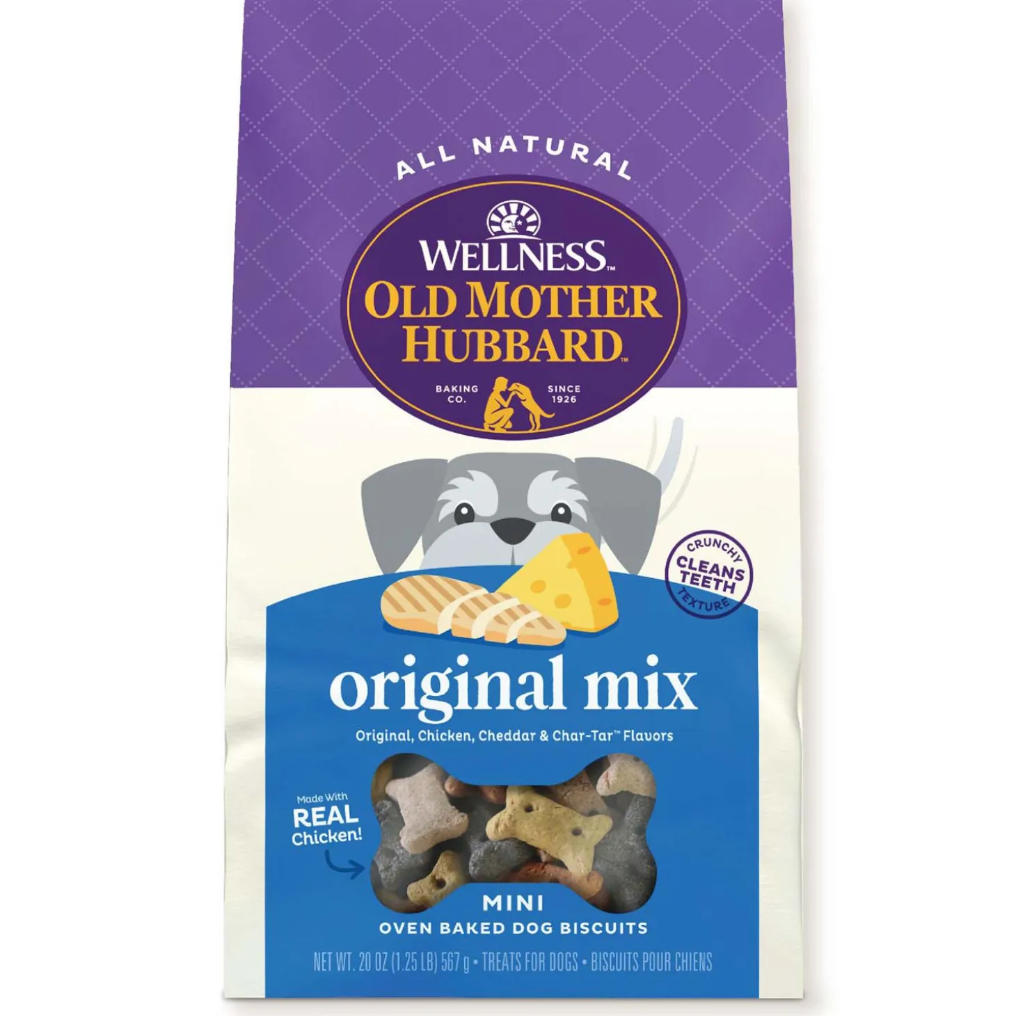 Old Mother Hubbard Original Mix Mini Dog Treats are all natural with no added artificial preservatives, and their crunchy texture helps clean teeth. Every treating moment is a chance to show ’em some love. That’s why these homestyle recipes start with wholesome, mouthwatering ingredients. Each biscuit is slowly oven-baked to preserve the natural flavours in all the varieties dogs love to catch, chew and eat. Original Mix contains an assortment of original, chicken, cheddar, and Char Tar flavours for a tasty and wholesome treat they’ll love getting and you’ll love giving. A classic great taste since 1926!