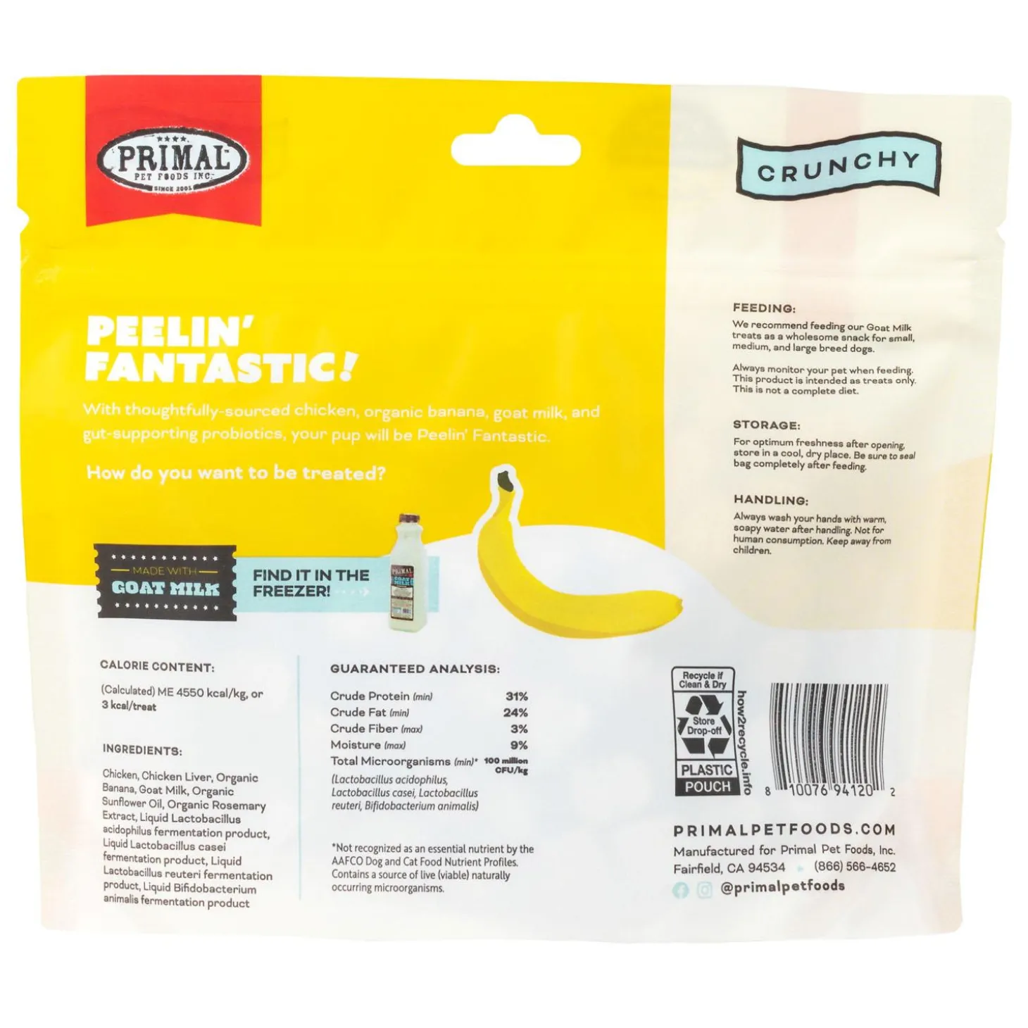 Primal Peelin’ Fantastic! Chicken, Banana & Goat Milk Dog Treats will have your pup Peelin’ Fantastic. These treats have thoughtfully-sourced chicken, organic banana, goat milk, and gut-supporting probiotics, your pup will be Peelin’ Fantastic.