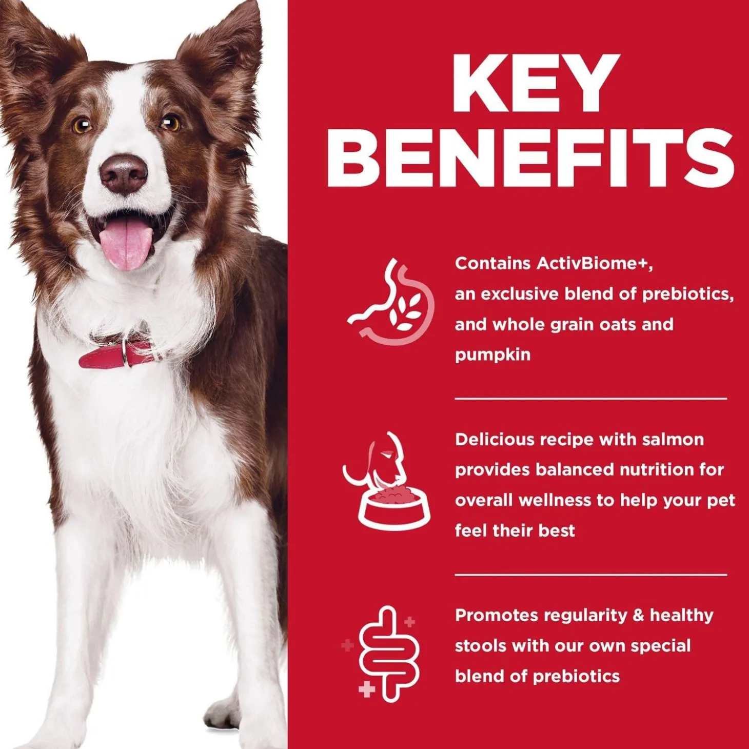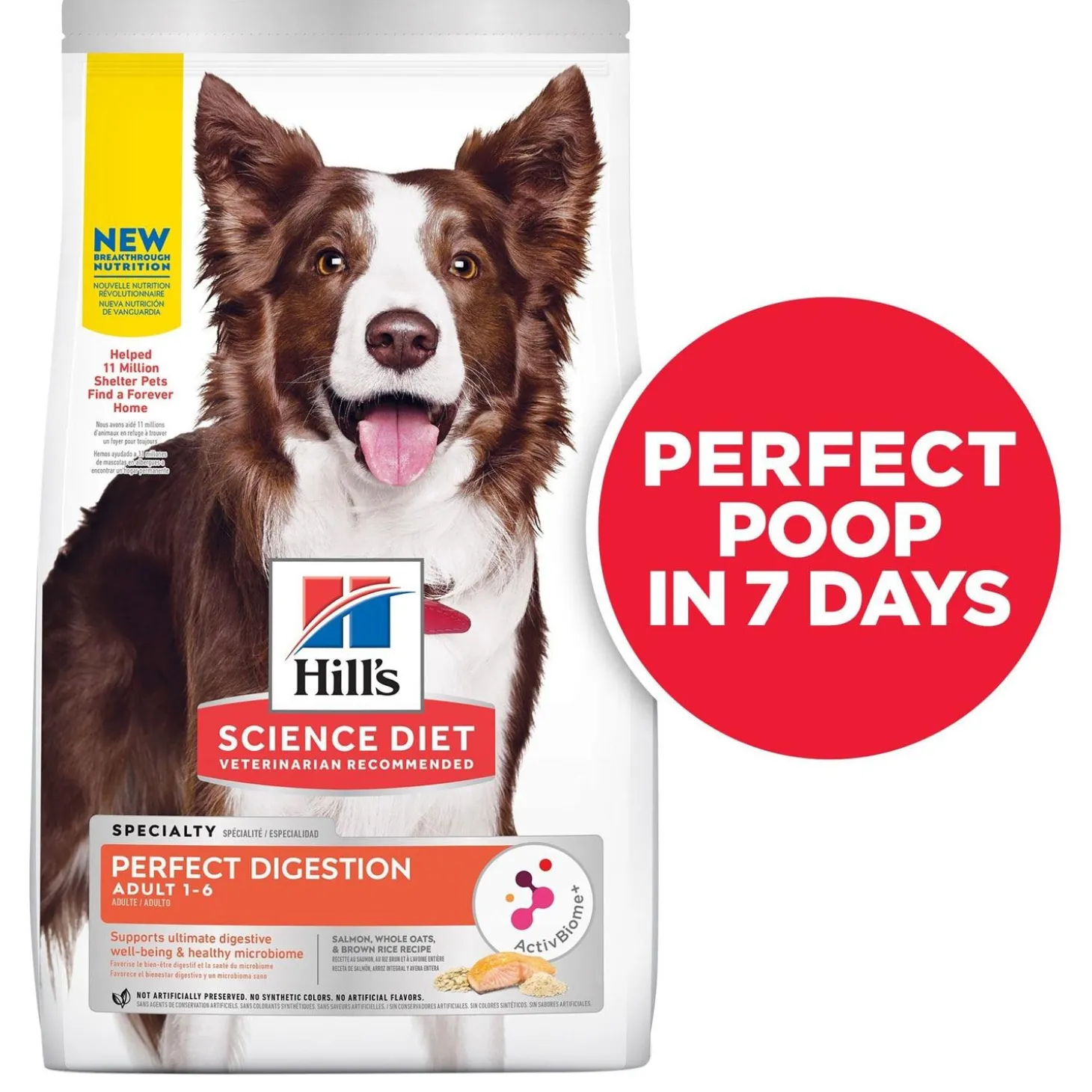 Hill’s Science Diet Perfect Digestion Salmon Whole Oats & Brown Rice Recipe Adult Dog Food is made with ActivBiome+ Technology ingredient blend of prebiotics. Every dog has an entire ecosystem living within them – the gut microbiome, full of billions of diverse microbes unique to your pet. With the right nutrients to help balance their microbiome, you can actually affect not only their digestive health, but their overall well-being. It’s a breakthrough nutrition that supports each dog’s unique gut microbiome for healthy digestion and balanced nutrition that helps your dog feel their best.