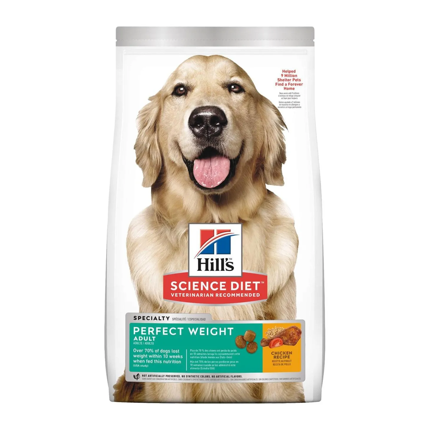 Hill’s Science Diet Perfect Weight Chicken Recipe Adult Dog Food provides delicious, breakthrough weight management nutrition that your full grown dog can enjoy. With protein for lean muscle maintenance, and clinically proven results in just 10 weeks, this weight control dog food made with natural ingredients is the perfect addition to your adult dog’s bowl.