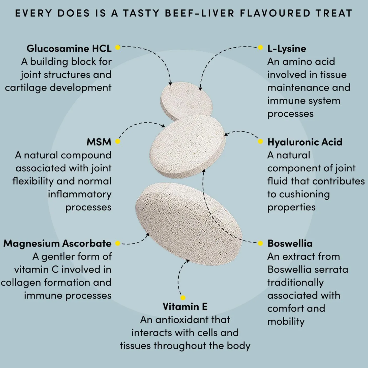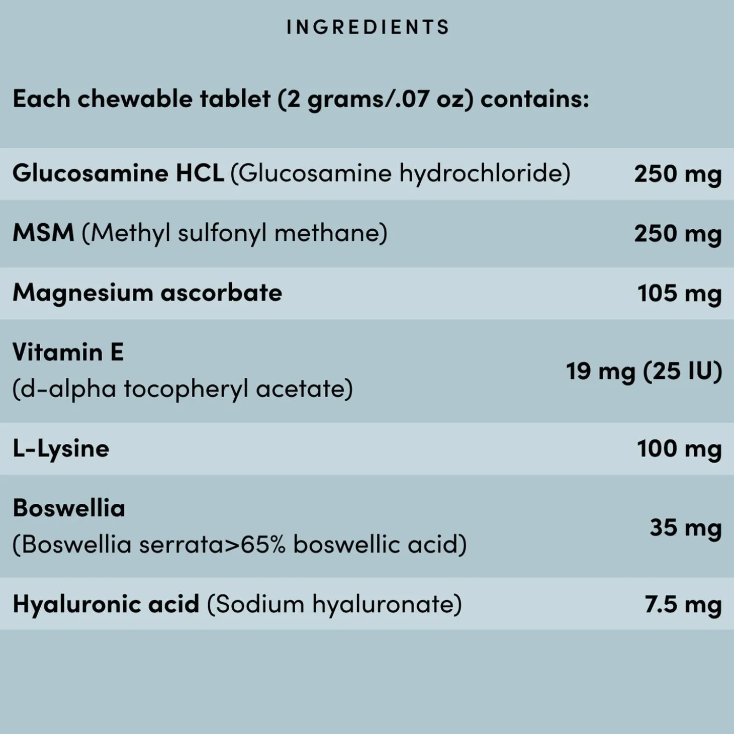 - For Preventative Care – Featuring glucosamine for structure, hyaluronic acid for cushioning, and Vitamin E for long-term mobility
