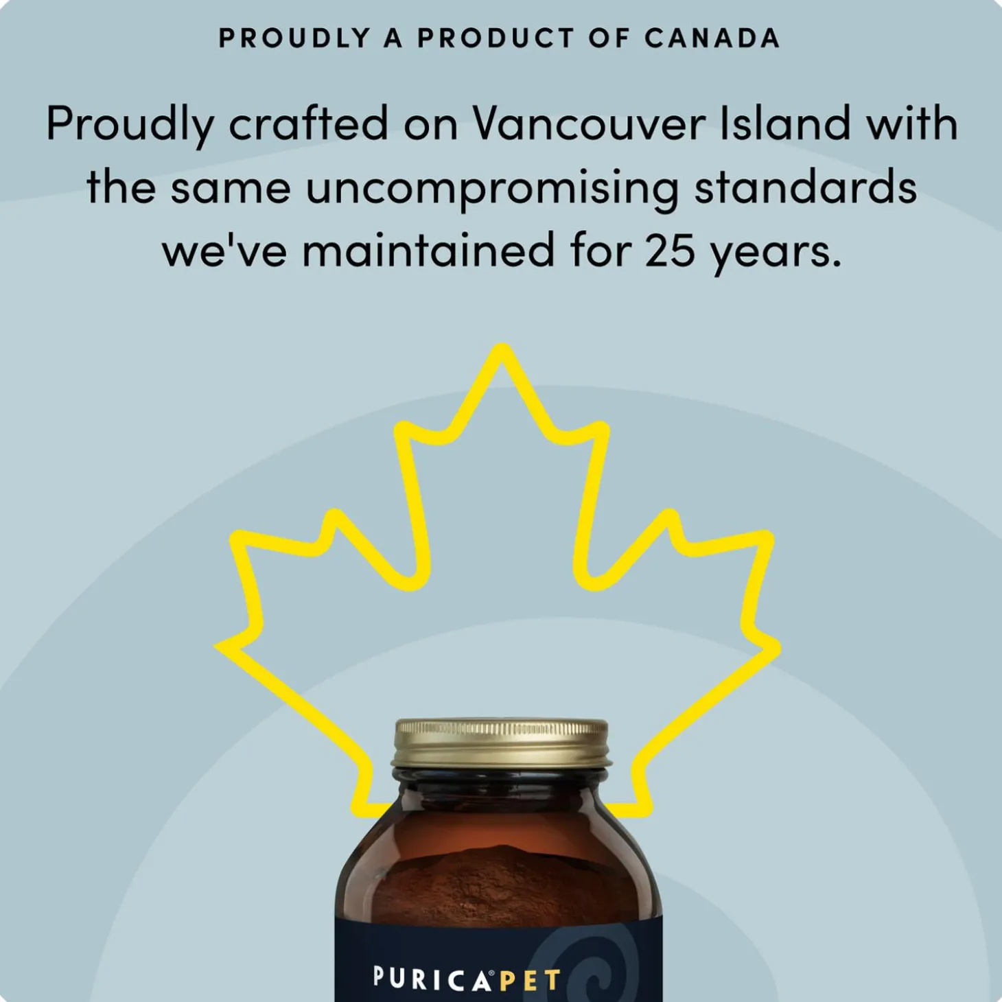 Purica Pet Recovery Extra Strength Advanced Mobility Formula Powder Pet Supplement is a natural joint support for dogs & cats. It can also be used for post-surgery recovery. With 25 years of proven results, these scientifically refined formulas combine the wisdom of ancient wellness with modern innovation to help pets live their fullest lives, at every age. Crafted in Canada with superior ingredients and unwavering commitment to quality. A complete spectrum of natural ingredients supporting your pet’s mobility needs – from active life to recovery and senior comfort.