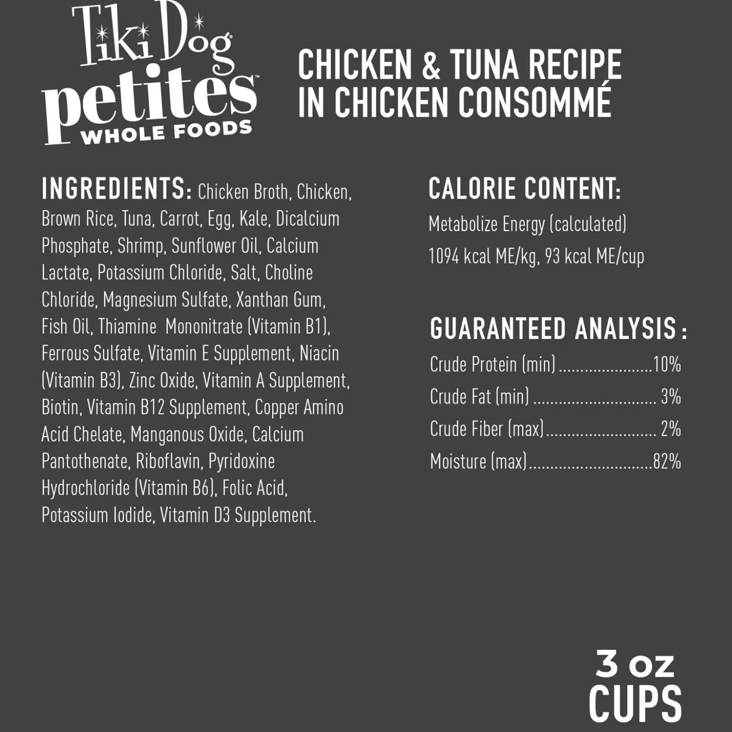 Tiki Dog Petites Whole Foods Chicken & Tuna Recipe in Chicken Consomme Adult Dog Food is made with whole foods you know and recognize like shredded chicken, healthy whole grain brown rice, egg, and nutrient-rich superfoods like carrots and kale. All of these delicious, non-GMO ingredients are hand-packed in a savory chicken consomme. It looks like it belongs in your bowl! Tiki Dog offers drool-worthy taste in the nutrition that dogs need! Designed with the highest standards in nutrition to keep dogs in optimal health, and you can see it in every bowl.