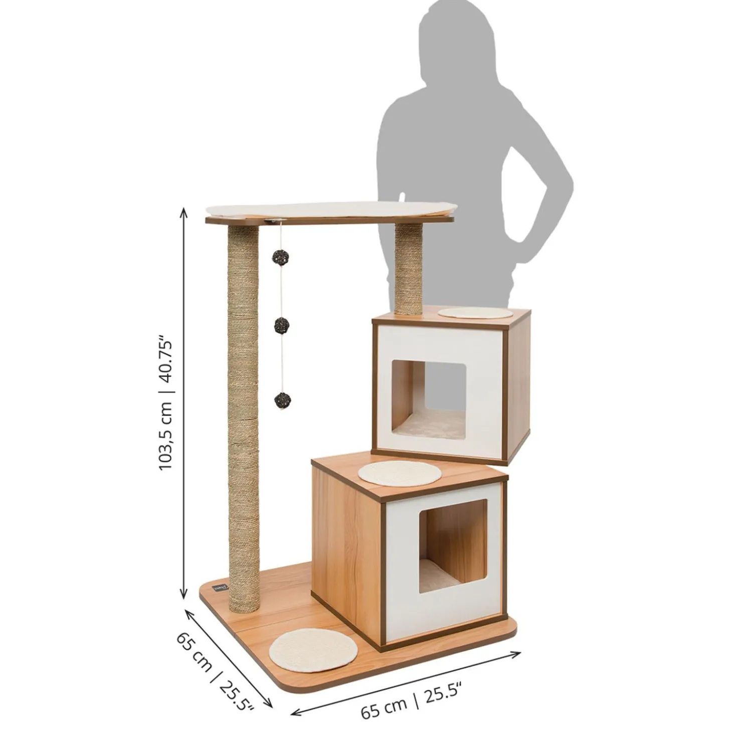 Catit PIXI Vesper Double Walnut Cat Tree is the perfect lounge and play tower for multiple cats. The Vesper Double has two dens and is perfect for two or more cats. Its multi-level design provides a place to nap as well as the opportunity to climb, jump, play, and scratch. After assembly, store away the included hex key (assembly tool) for making future adjustments or installing replacement parts.