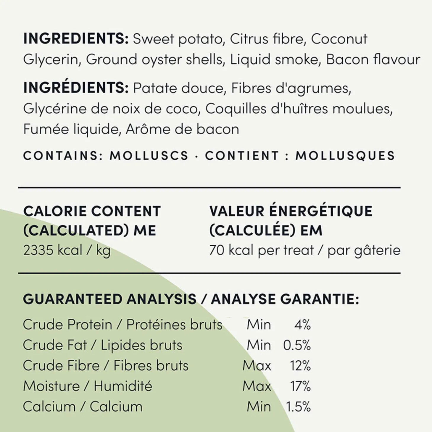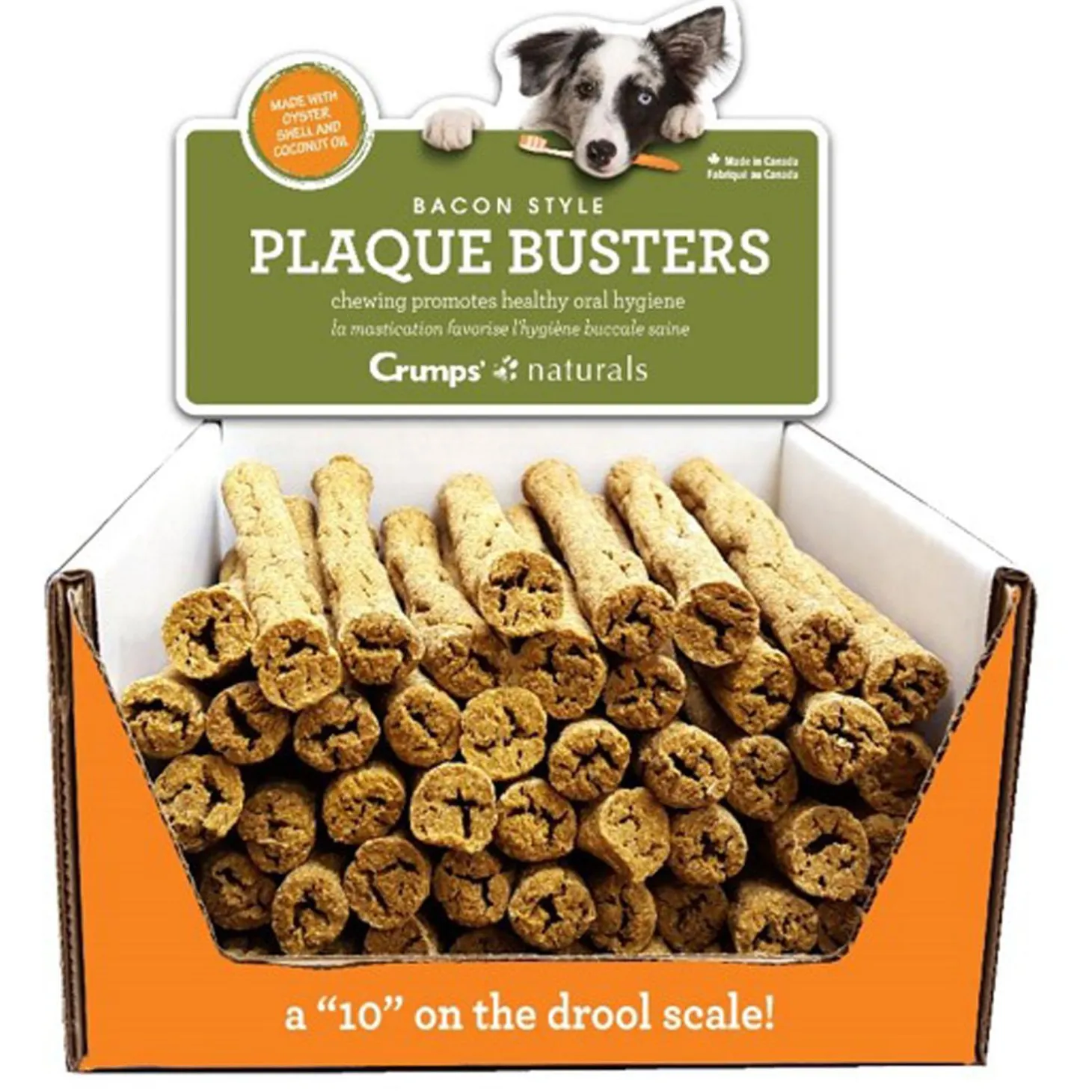 - The scent of bacon gets dogs excited about these treats, while finely-ground oyster shells aid in the removal of plaque and tartar