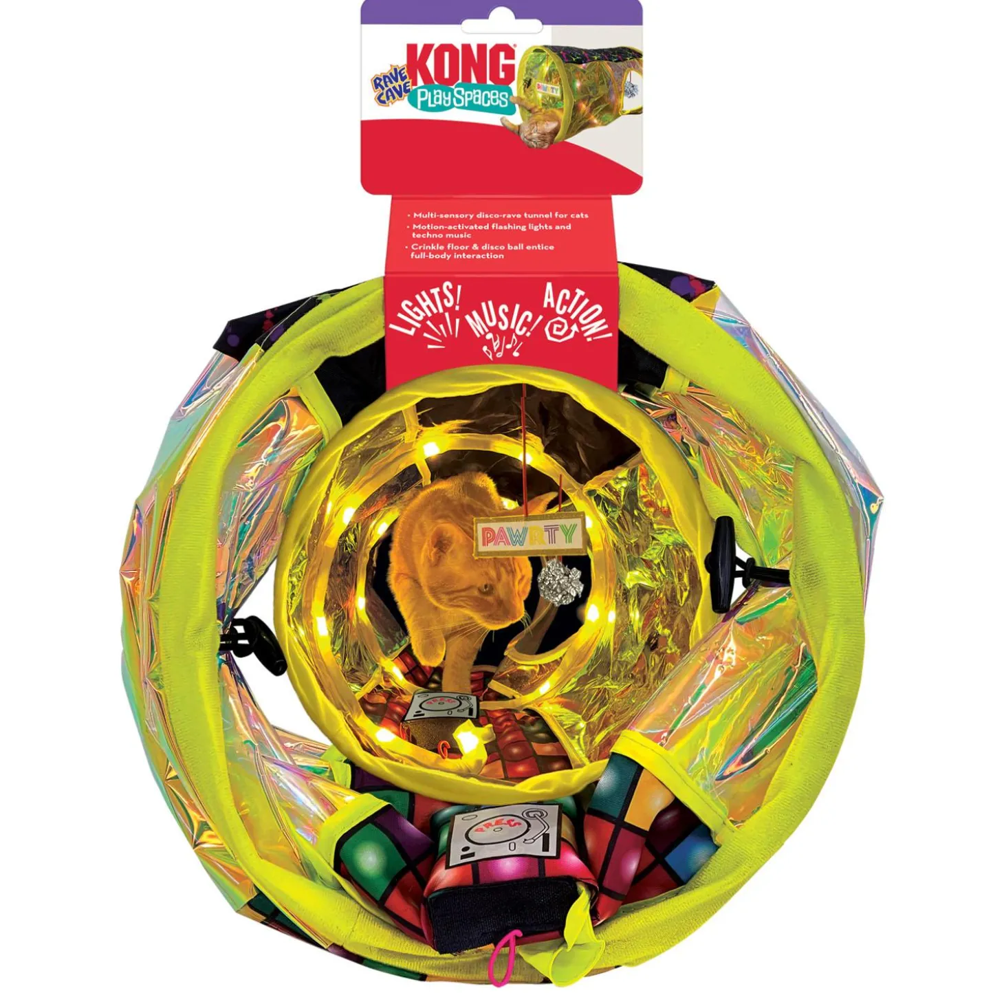 KONG Play Spaces Rave Cave Cat Tunnel brings the fever to your cat’s Saturday nights – or any night or day! The crackling floor entices full-body kitty breakdancing, as motion-activated 90s techno beats start pumping and retro lights begin flashing, enticing your cat’s multiple senses. A shiny disco ball hangs from the ceiling, inviting batting & boogying. When the party’s over, easily fold up this tunnel and pack it away until it’s time to drop it like it’s hot again. Energetic cats will love this interactive tunnel for batting, stalking, pouncing, and partying. On/off switch gives kitties an option for silent and dark disco nights.
