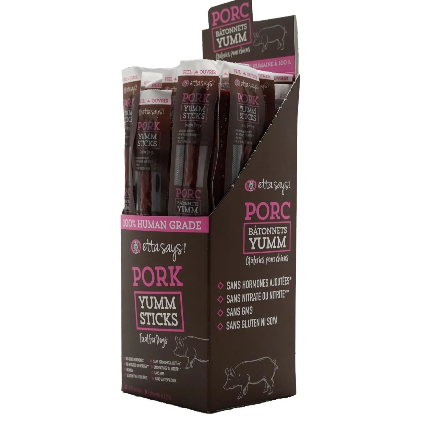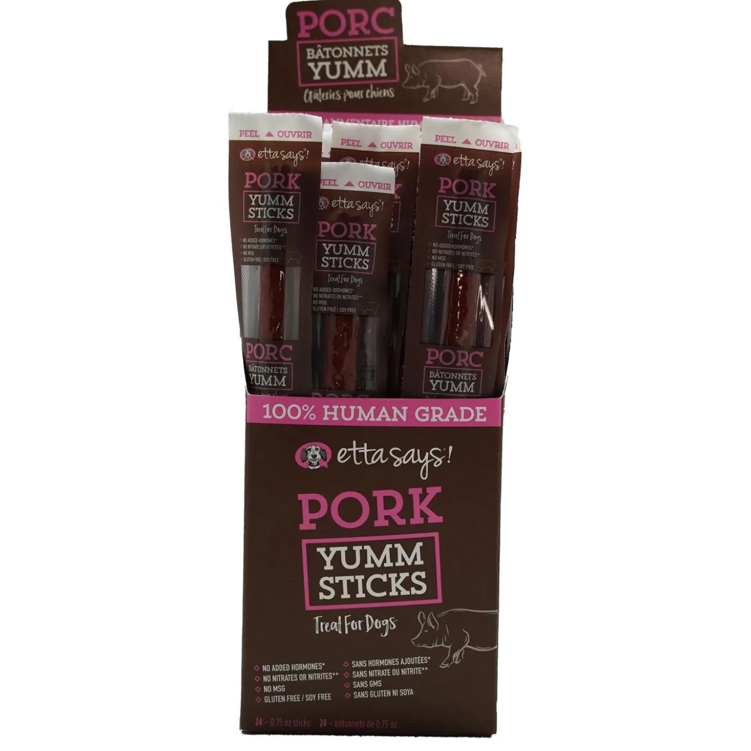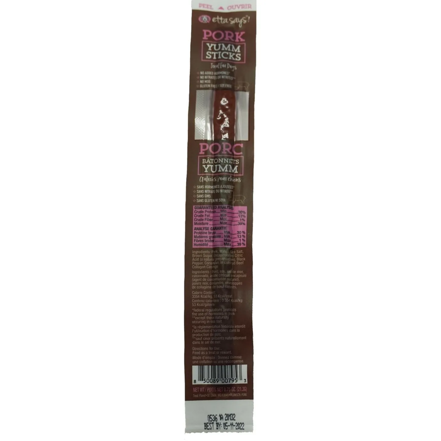 Etta Says! Pork Yumm Stick Dog Treat is packed with flavour and protein to keep your dog fueled for whatever adventure they go on. These treats are 100% human-grade with high protein and low fat. Each Yumm Stick is individually wrapped for easy, on the go convenience. Keep some handy in your car, bag, or backpack for a treat you can both enjoy. As always these products are proudly made and sourced in the USA.